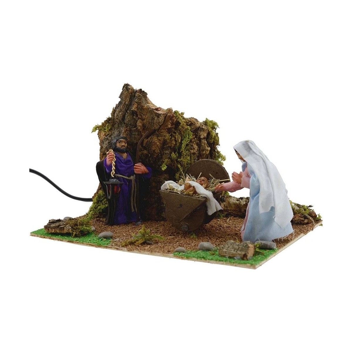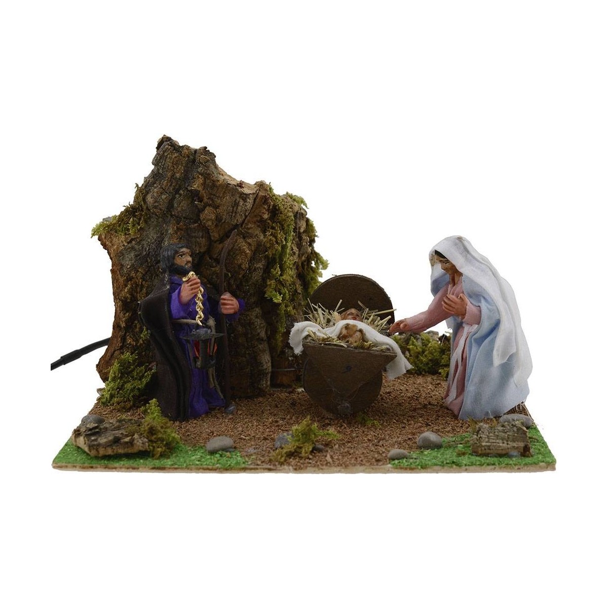 Nativity in motion, Mary moves the cradle and St. Joseph moves the lantern. The statues are in terracotta dressed in fabric, height 8 cm.