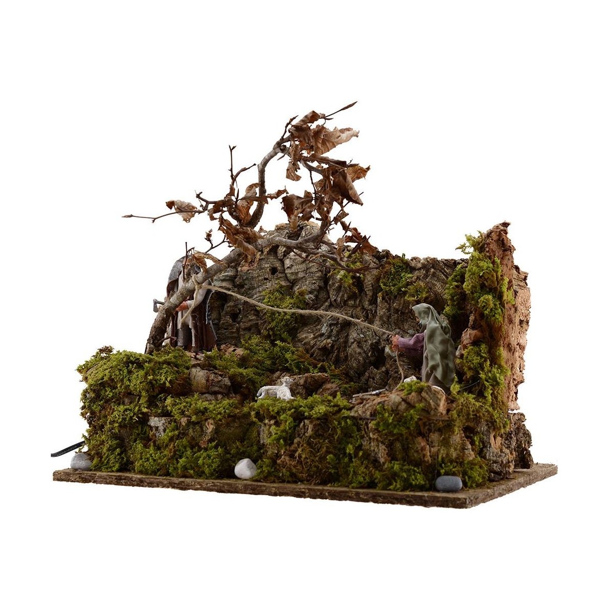 Pair of 10 cm lumbergs who are knocking down a tree, the character on the left impuses a hatchet that beats on the trunk and the statue on the right pulls the rope with which the tree is tied. A well-refinished wooded landscape with moss, rocks and rocks ; there are three sheep and other tools as well as charm beams. The movement turns out to be fluid and is functional to the current. The scene can enrich your presepe and attract the attention of the visitor.
