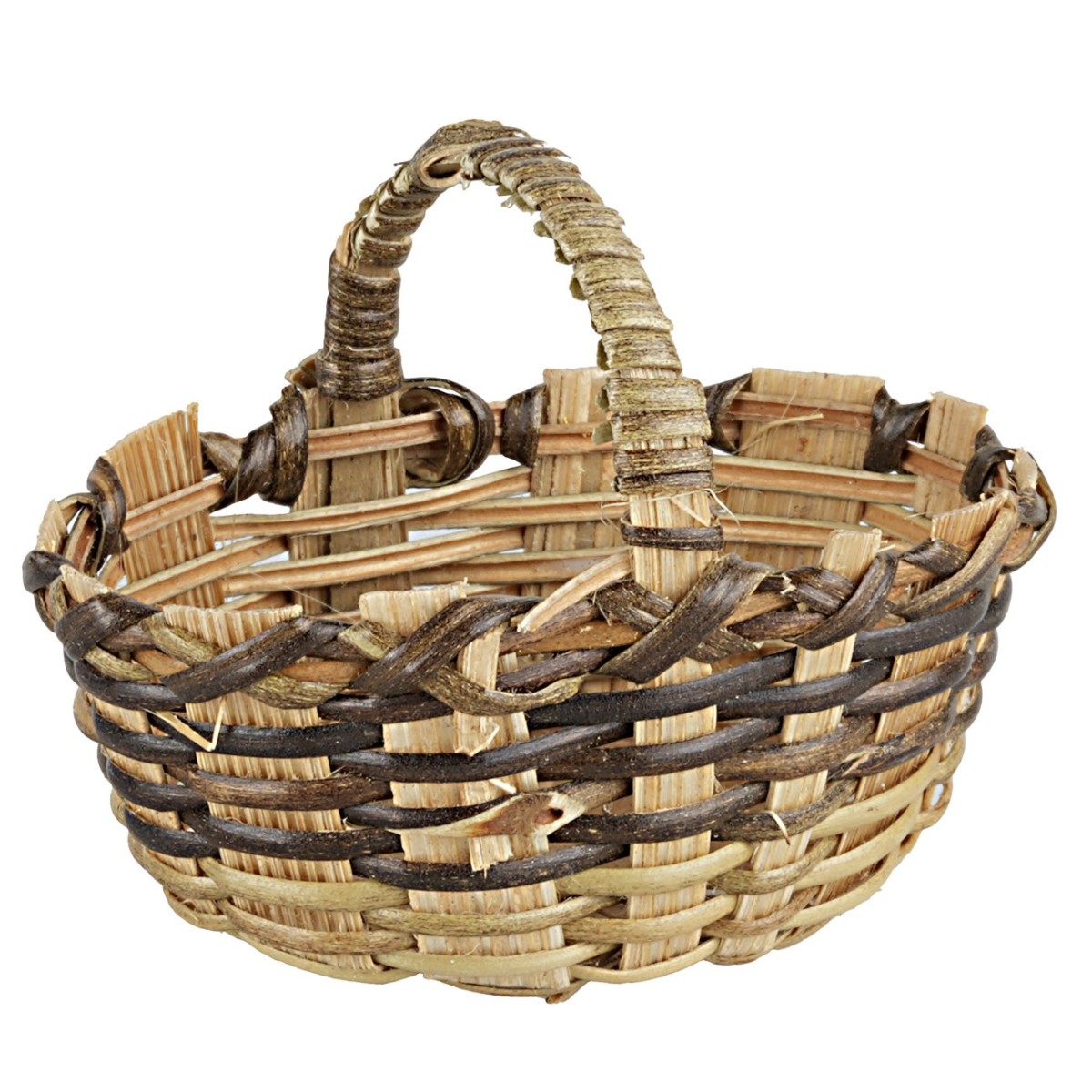 Cesta con manico in vimini, in miniatura. È consigliato l'utilizzo con statuine di altezza da 15 a 24 cm. L'accessorio è personalizzabile, acquistando le MINUTERIE disponibili nella categoria dedicata, ed è perfetto per completare il presepe fai da te.