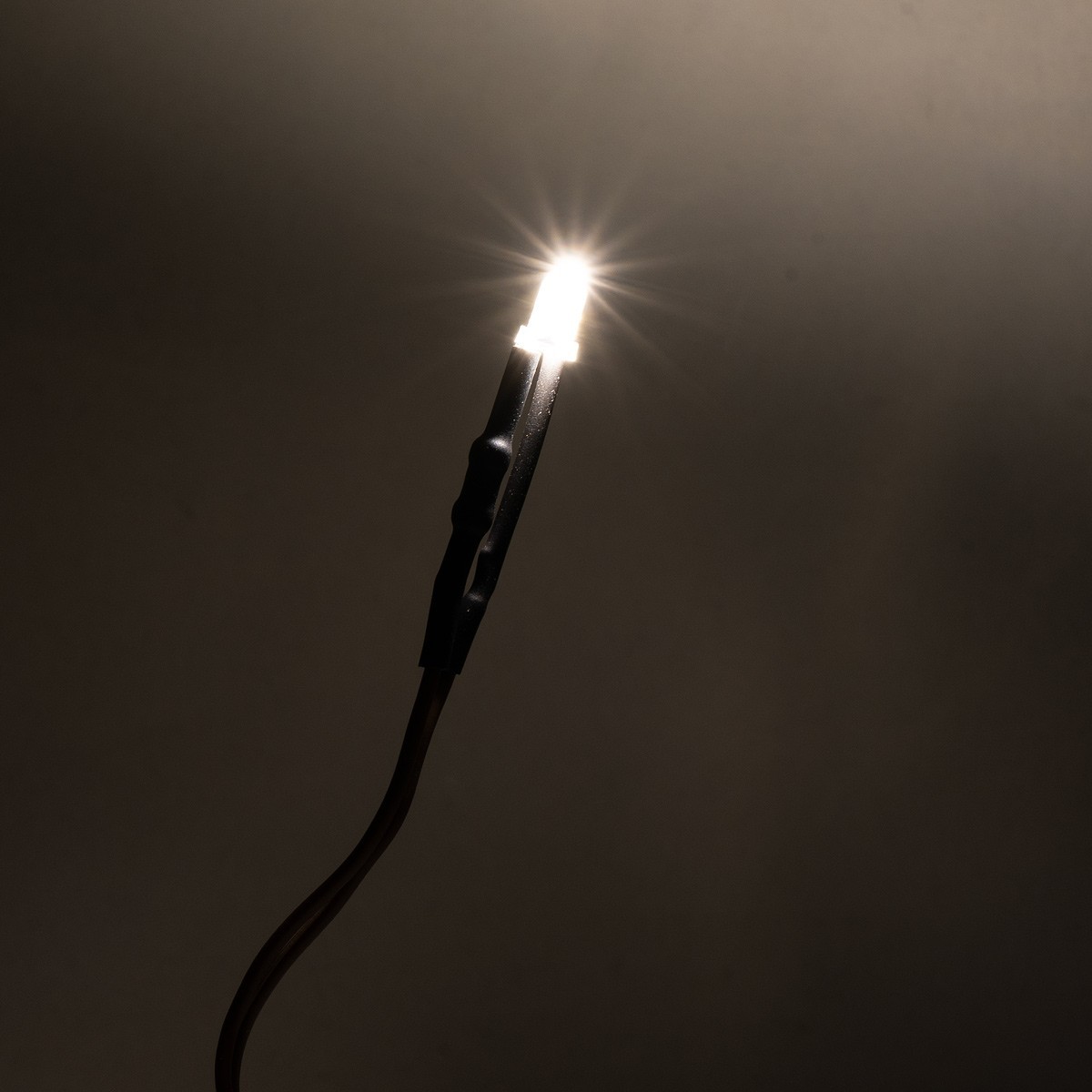 5 mm warm white LED light with 20 cm cable, illuminated and operating on current with 12 V power supply.