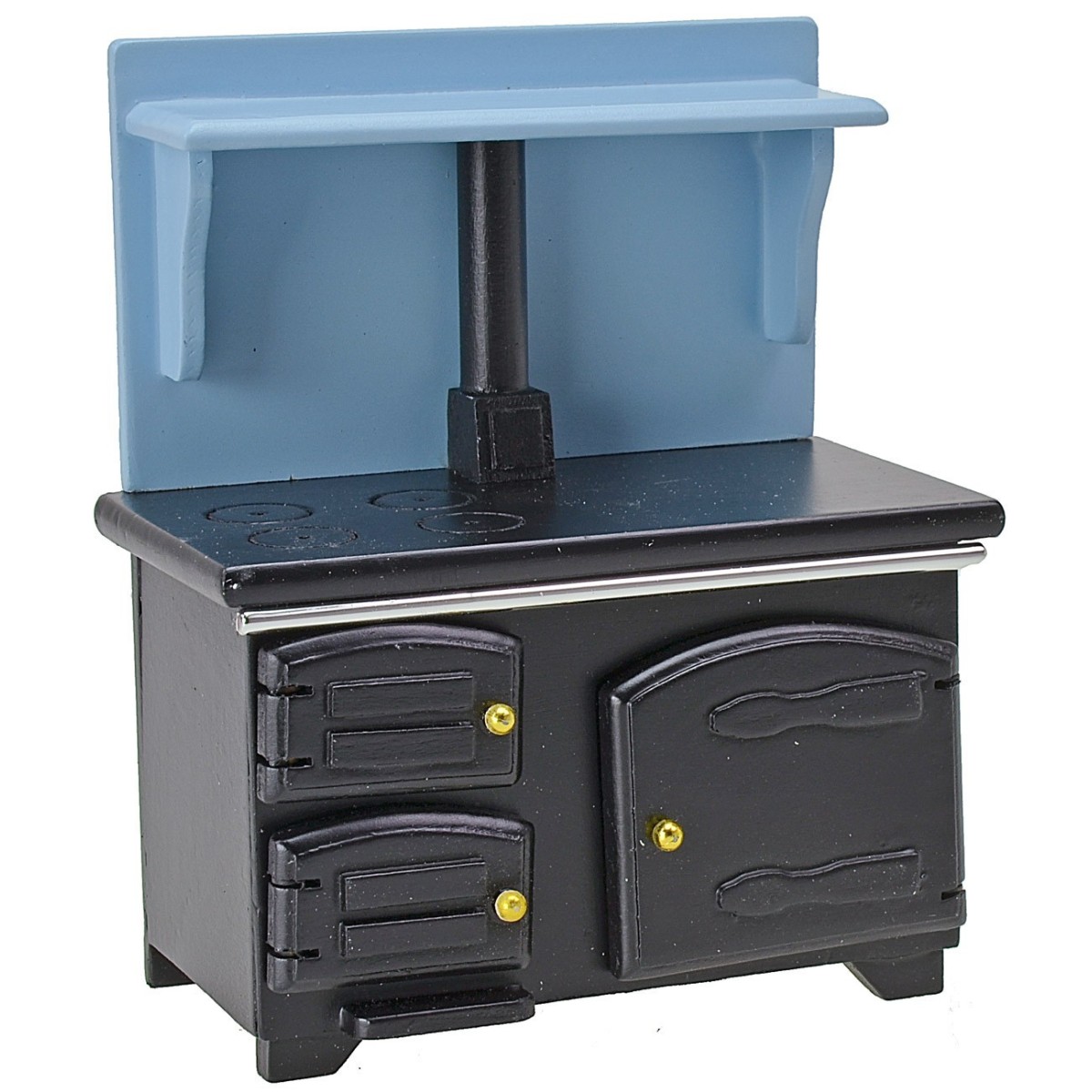 Stufa per cucina con tre sportelli, uno era riservato all' accensione del fuoco e al rifornimento di legna, mentre gli altri ad utilizzo forno per cuocere il cibo. Sulla grande piastra sono presenti dei fornelli dove potevano essere riposte le pentole o i bollitori a scaldare. Sul retro la canna fumaria e una mensola azzurra da poter arricchire con diversi oggetti presenti nella categoria minuterie. L'articolo è consigliato per statue di altezza 12-14 cm.
