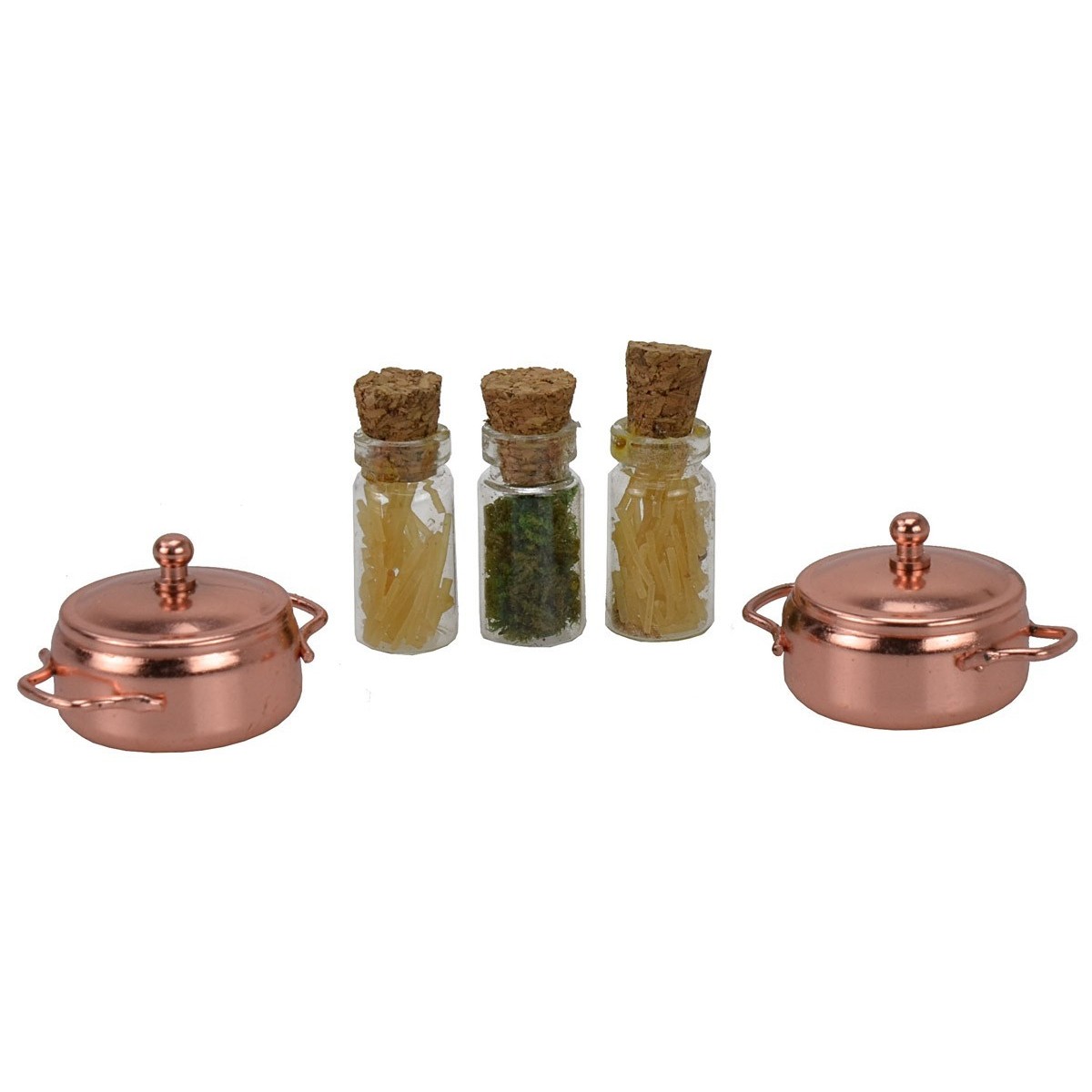 Kitchen set consisting of two copper pots with lids and three glass jars containing pasta and herbs, recommended for statues 10-12 cm tall.