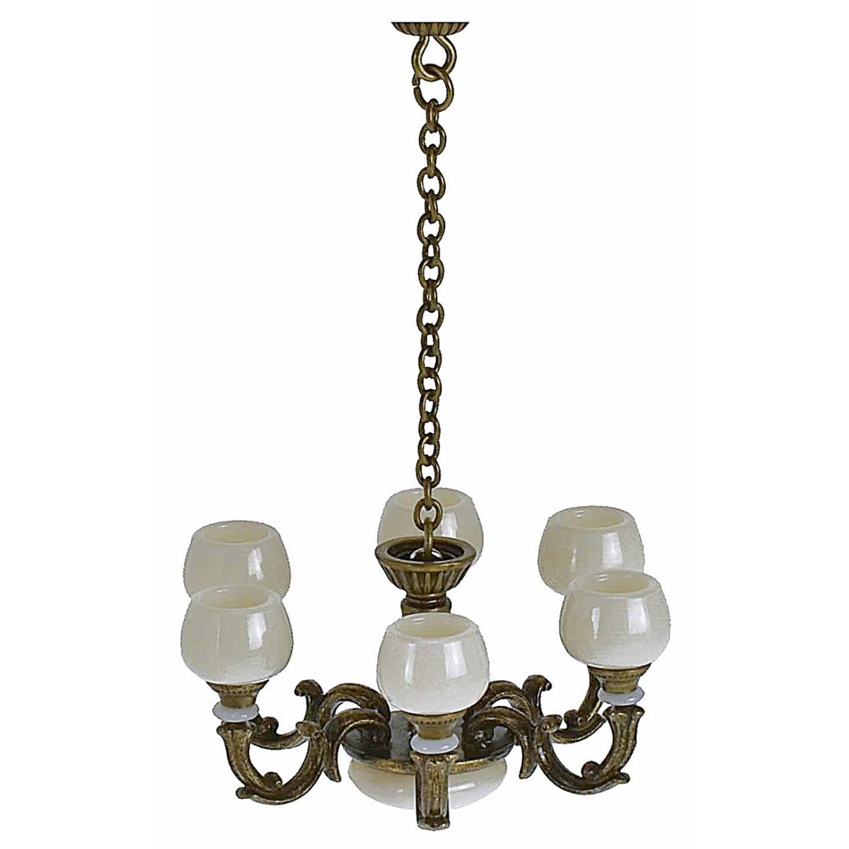Lampadario a 6 bracci color bronzo, dotato di calamita per fissarlo al soffitto. L'articolo è perfetto per il presepe fai da te e per le case delle bambole. Si precisa che il lampadario a la sola funzione decorativa, ed è sprovvisto di punti luce.