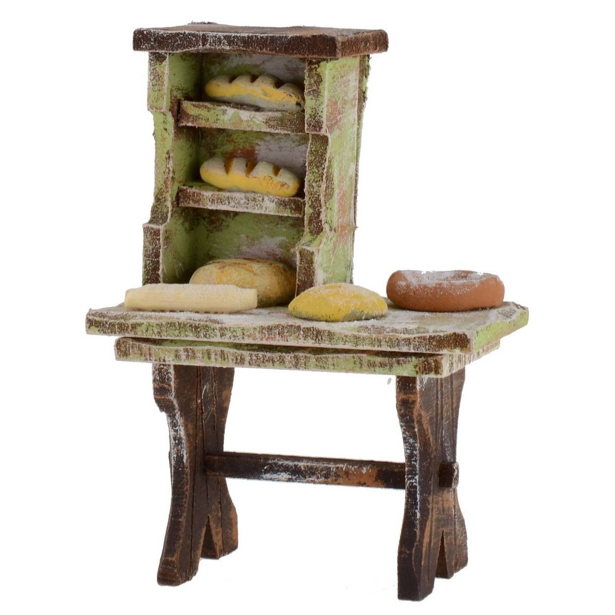 Wooden bench from work of a baker for Presepe, equipped with terracotta and wood minuteries, made entirely by hand and advised for statues of height cm 10.