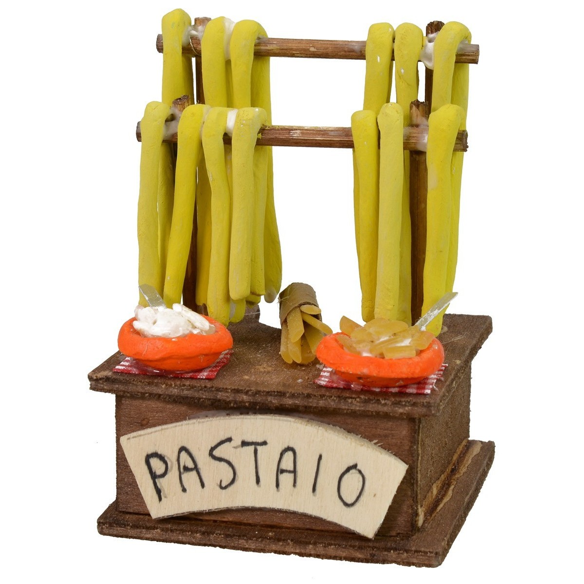 Banchetto del pastaio, realizzato artigianalmente da sapienti mani italiane utilizzando il legno per la struttura e dipingendo a mano la terracotta per la minuteria. Il prodotto risulta ben rifinito nei dettagli: è presente l'insegna in cima ed è colmo di minuterie raffiguranti la pasta fresca stesa e quella già cucinata all'interno dei piatti. Prodotto consigliato per donare un tocco di originalità al proprio Presepe. Dietro il banco espositivo è possibile collocare statue di 6,5 h cm, mentre ai lati e davanti al banco anche statue da 8 h cm in base ai propri gusti e preferenze.