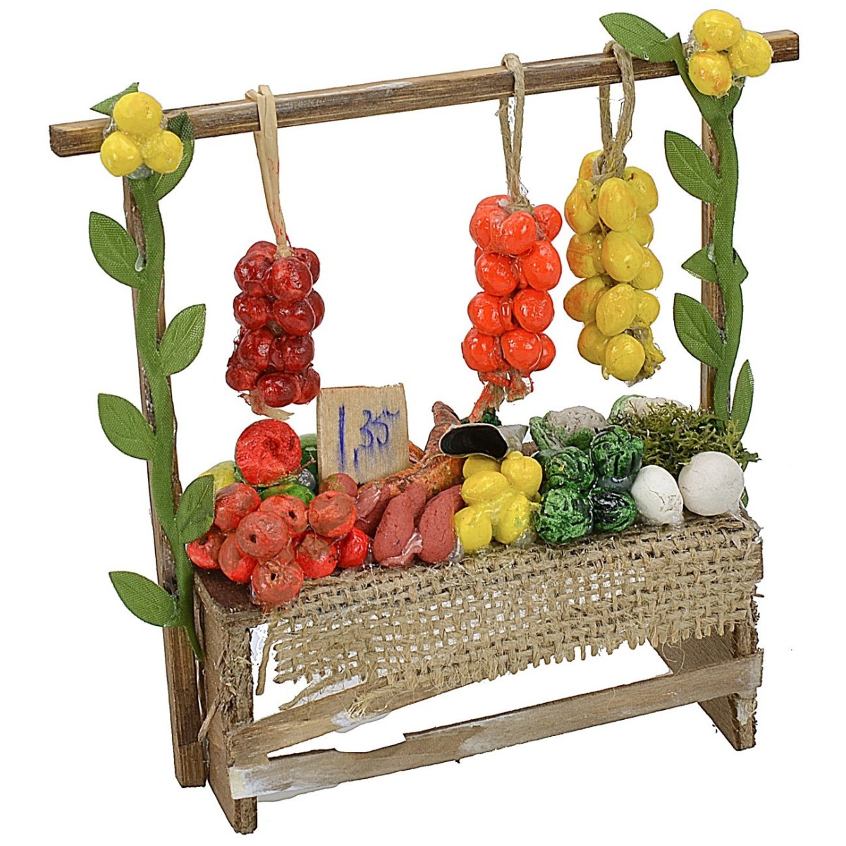 Banco molto colorato e rifinito da una struttura in legno con agrumi appesi, sul banchetto sono esposte frutta e verdura destinata alla vendita. Questo articolo è molto originale, è stato realizzato da artigiani italiani ed consigliato per statue altezza 10-12 cm. Nella sezione MINUTERIE sono disponibili tanti accessori per presepe da abbinare per personalizzare ed arricchire questo prodotto.