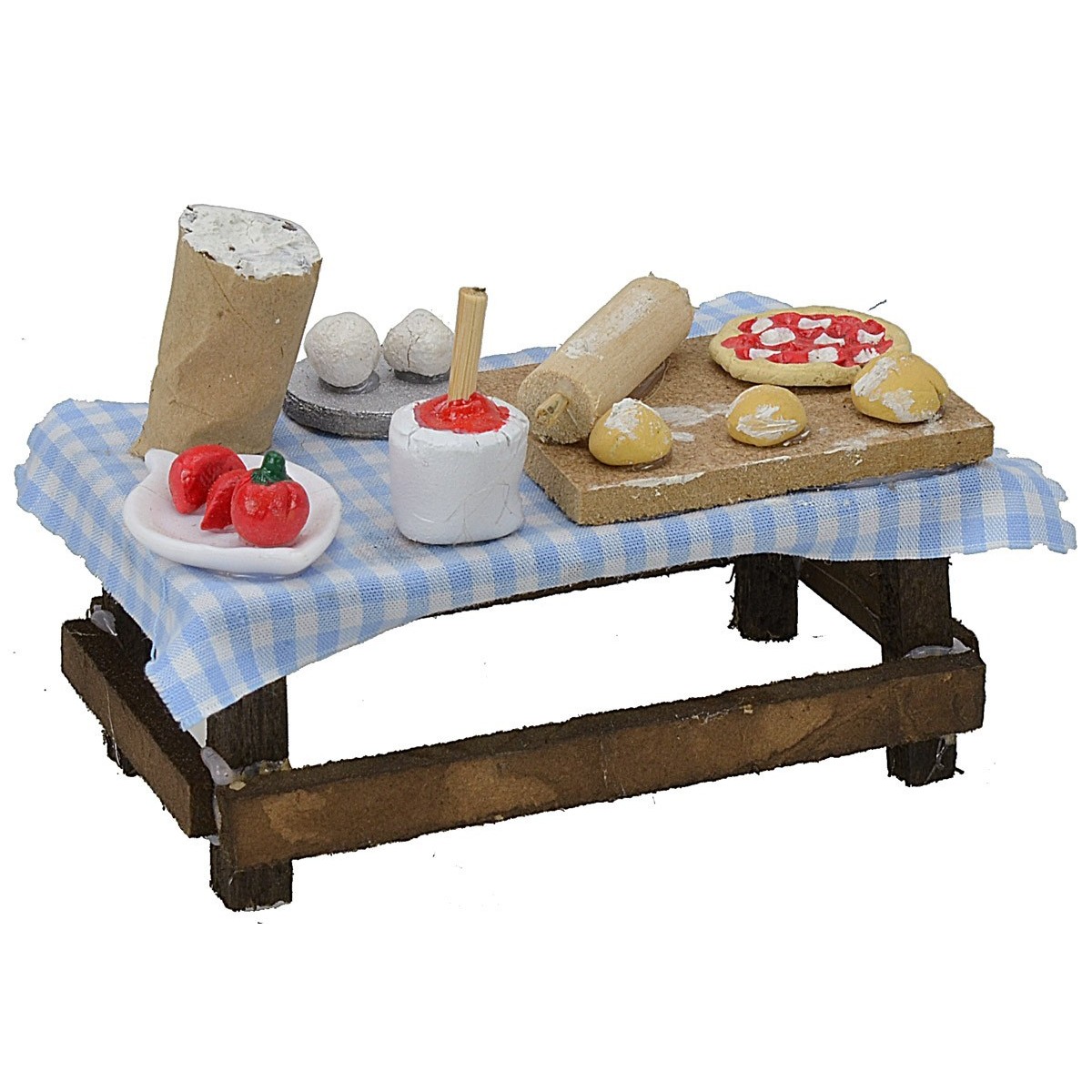 Banco del pizzaiolo realizzato artigianalmente in Italia con struttura in legno, il piano è coperto da una tovaglia a quadri dove sono riposti diversi alimenti necessari alla preparazione della pizza. Questo articolo è consigliato per statue altezza da 9 a 10 cm e si precisa che essendo prodotto a mano potrebbe leggermente variare rispetto alla foto. Nella sezione MINUTERIE sono disponibili tanti accessori per presepe da abbinare.