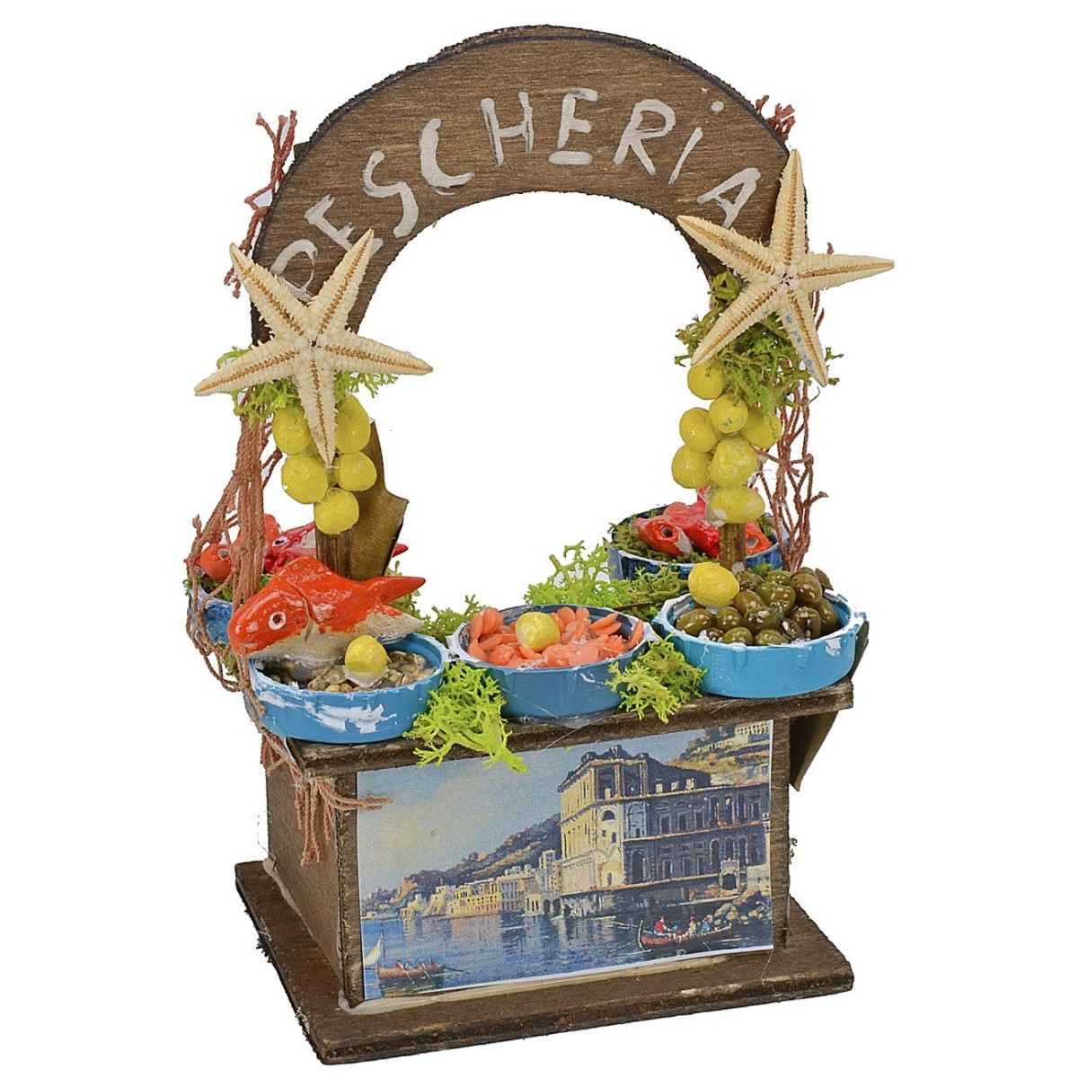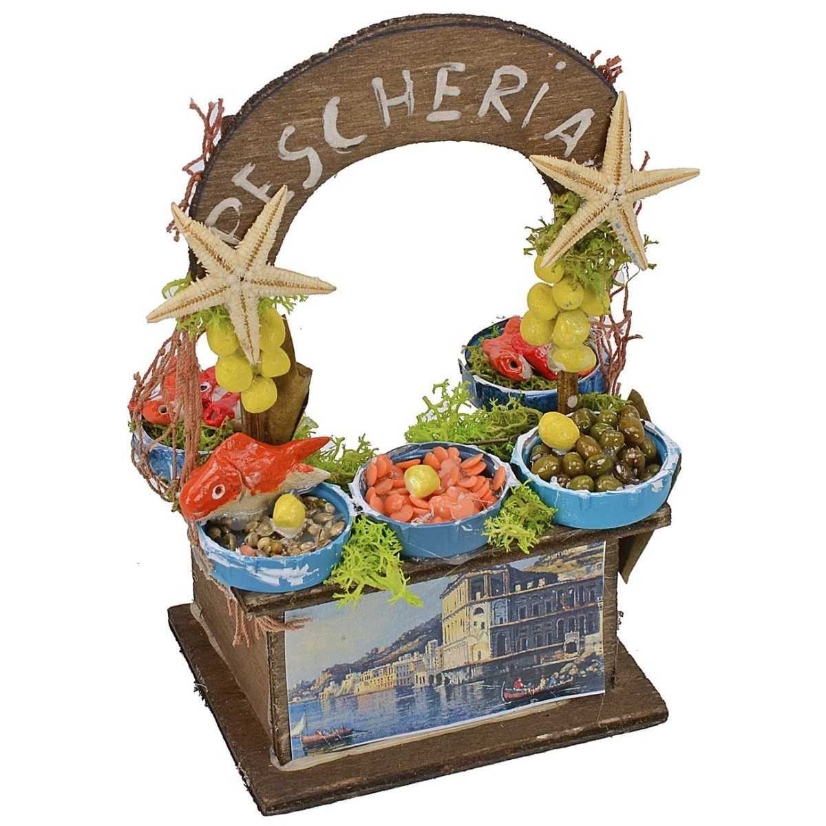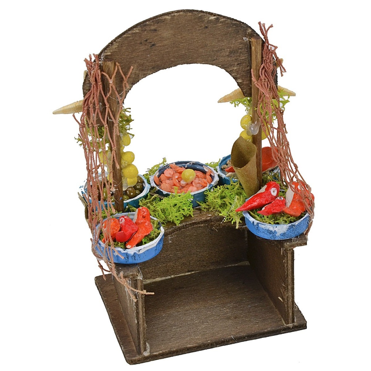 Bancarella del pescivendolo per presepe realizzato artigianalmente da sapienti mani italiane utilizzando il legno per la struttura e dipingendo a mano la terracotta per la minuteria. L' articolo risulta ben rifinito nei dettagli: è presente l'insegna in cima ed è colmo di vari tipi pesce. Il pezzo è consigliato per statue di altezza 10 cm e si precisa che essendo prodotto a mano potrebbe leggermente variare rispetto alla foto. Nella sezione MINUTERIE sono disponibili tanti accessori per presepe da abbinare per personalizzarlo.