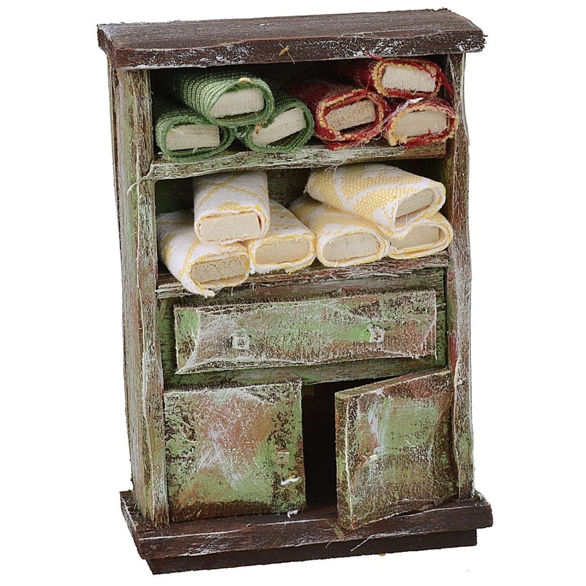 Scaffale in legno per bottega di scampoli con rotoli di stoffe nei ripiani superiori, un cassetto centrale e due ante nella parte inferiore . Il prodotto è realizzato in legno ed è consigliato per statue di altezza di 10 cm. Nei prodotti correlati sotto la tabella è possibile trovare la bottega del commerciante da abbinare.