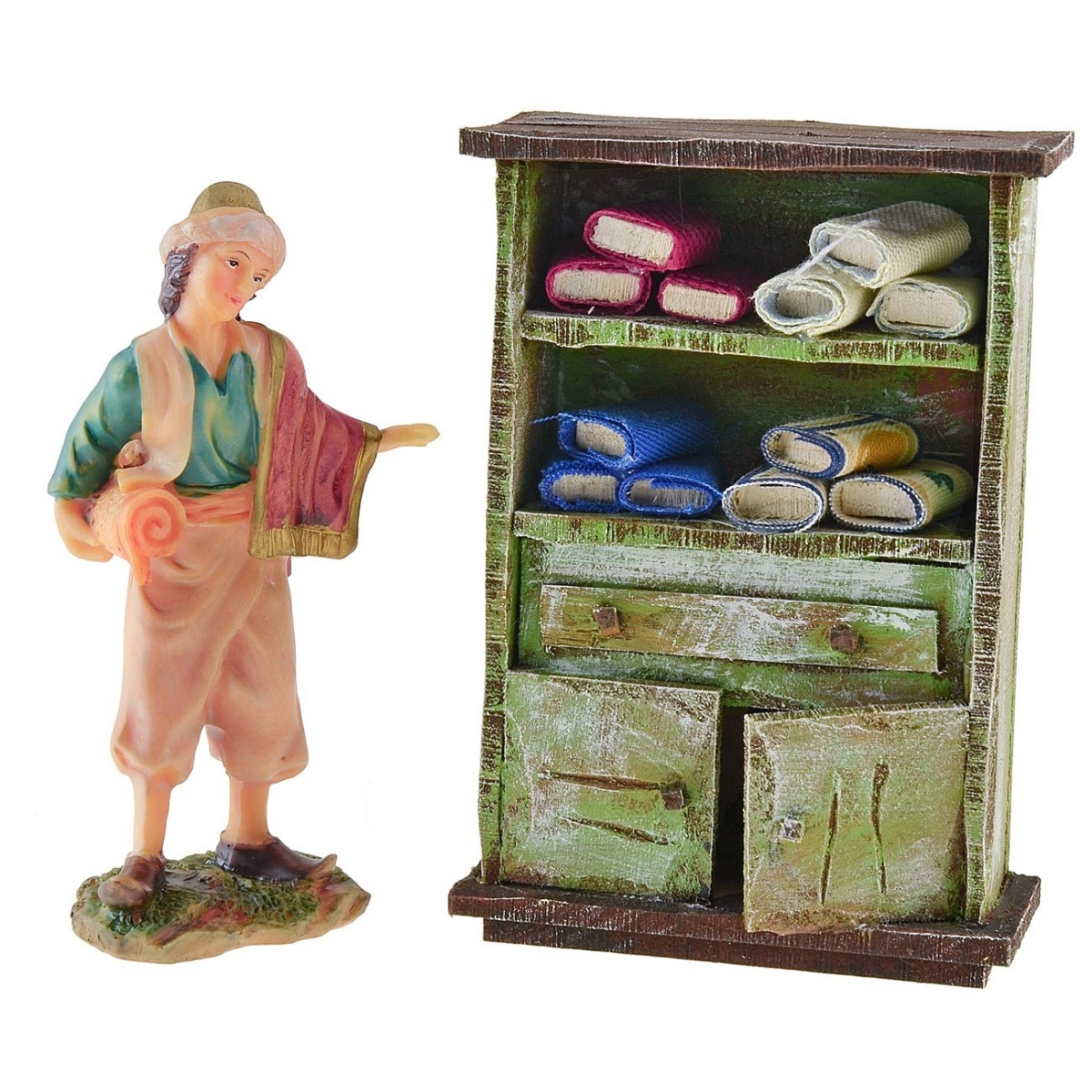Scaffale in legno per bottega di scampoli con rotoli di stoffe nei ripiani superiori, un cassetto centrale e due ante nella parte inferiore . Il prodotto è realizzato in legno ed è consigliato per statue di altezza di 12 cm. Si precisa che la figura inserita, è al solo scopo dimostrativo, ed è possibile acquistarla nei prodotti correlati sotto la tabella. Inoltre è possibile trovare anche la bottega del commerciante da abbinare.