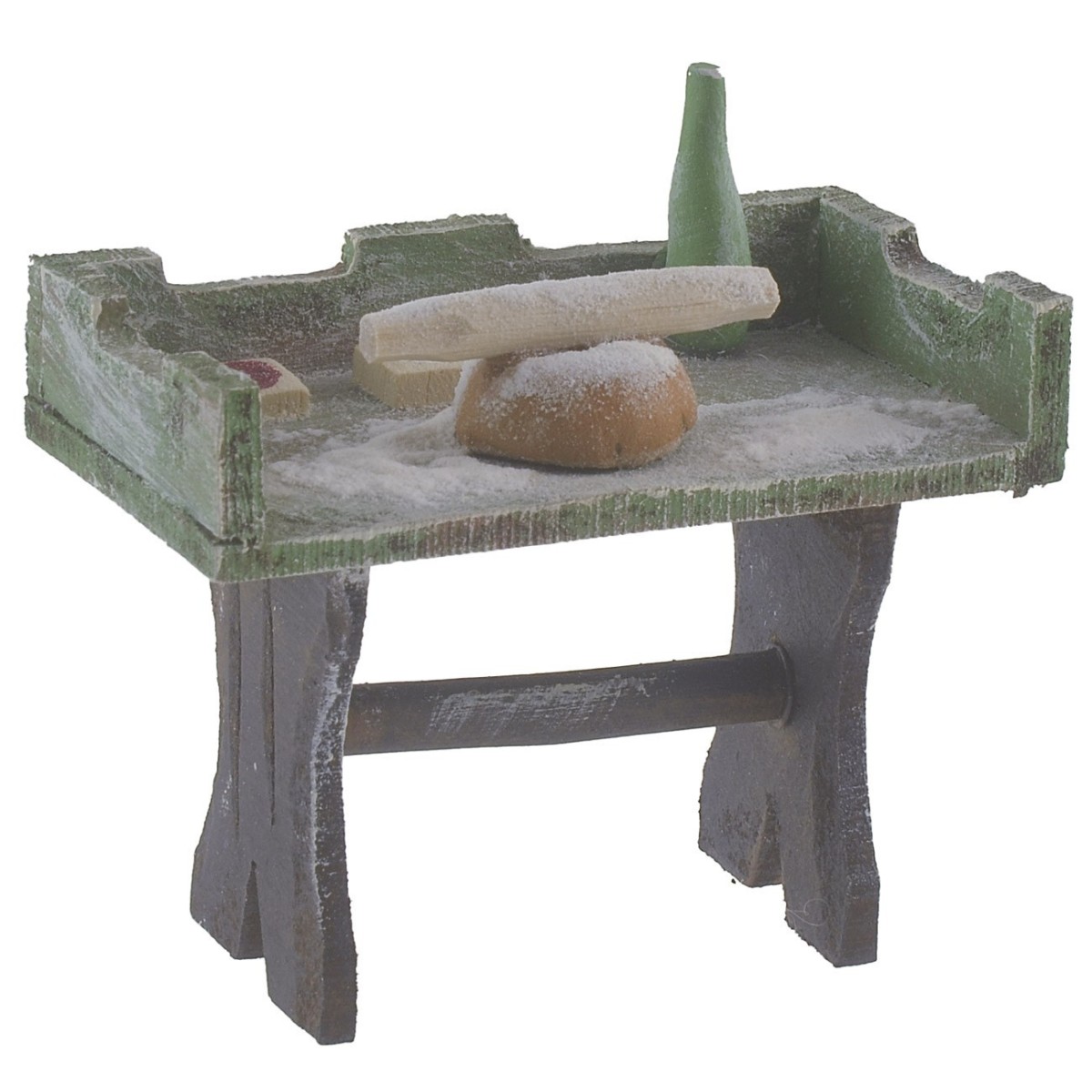 Banco con pasta per la pizza e mattarello, condimenti e bottiglia. Si consiglia l'utilizzo per statue altezza 12 cm, ideale per la creazione di fiere o mercati nel vostro Presepe. L'articolo è stato realizzato a mano da artigiani italiani.