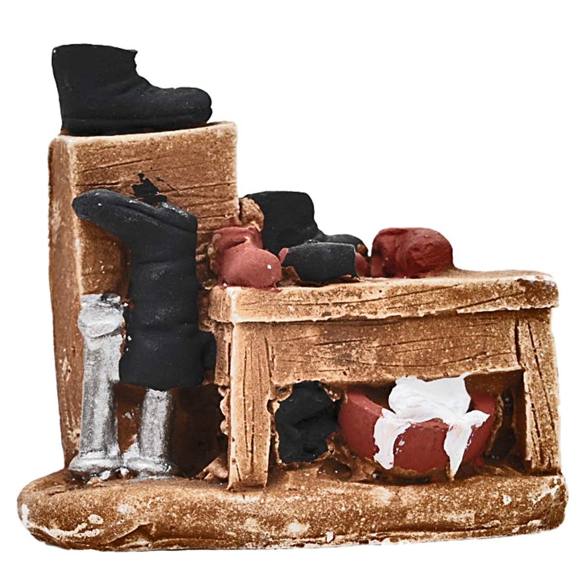 Miniature cobbler's bench, made of plaster and hand-painted, includes shoes and work tools.