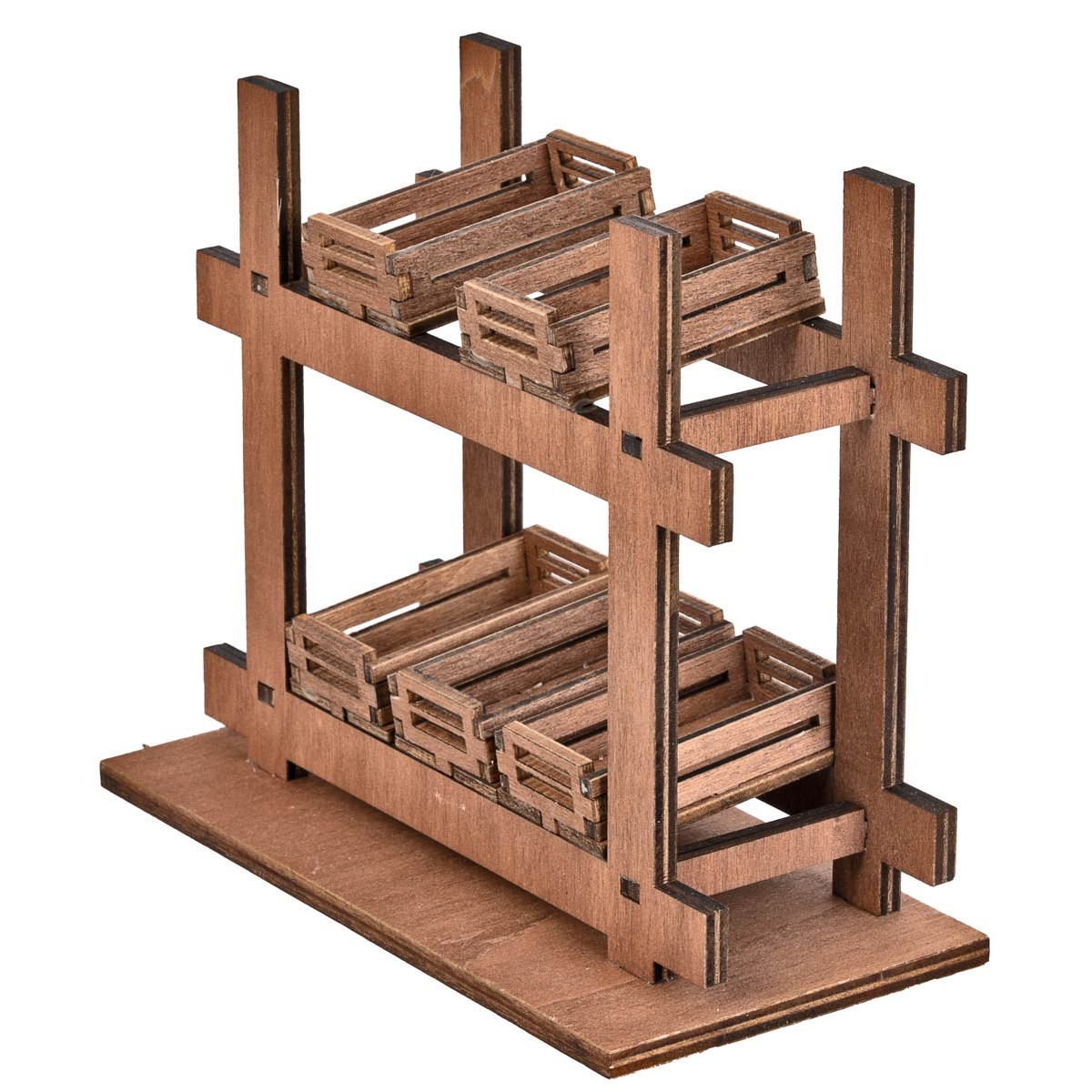 Two-level wooden stall composed of six inclined crates, supported by a robust structure with visible joints. Ideal for setting up market scenes or miniature rural settings.