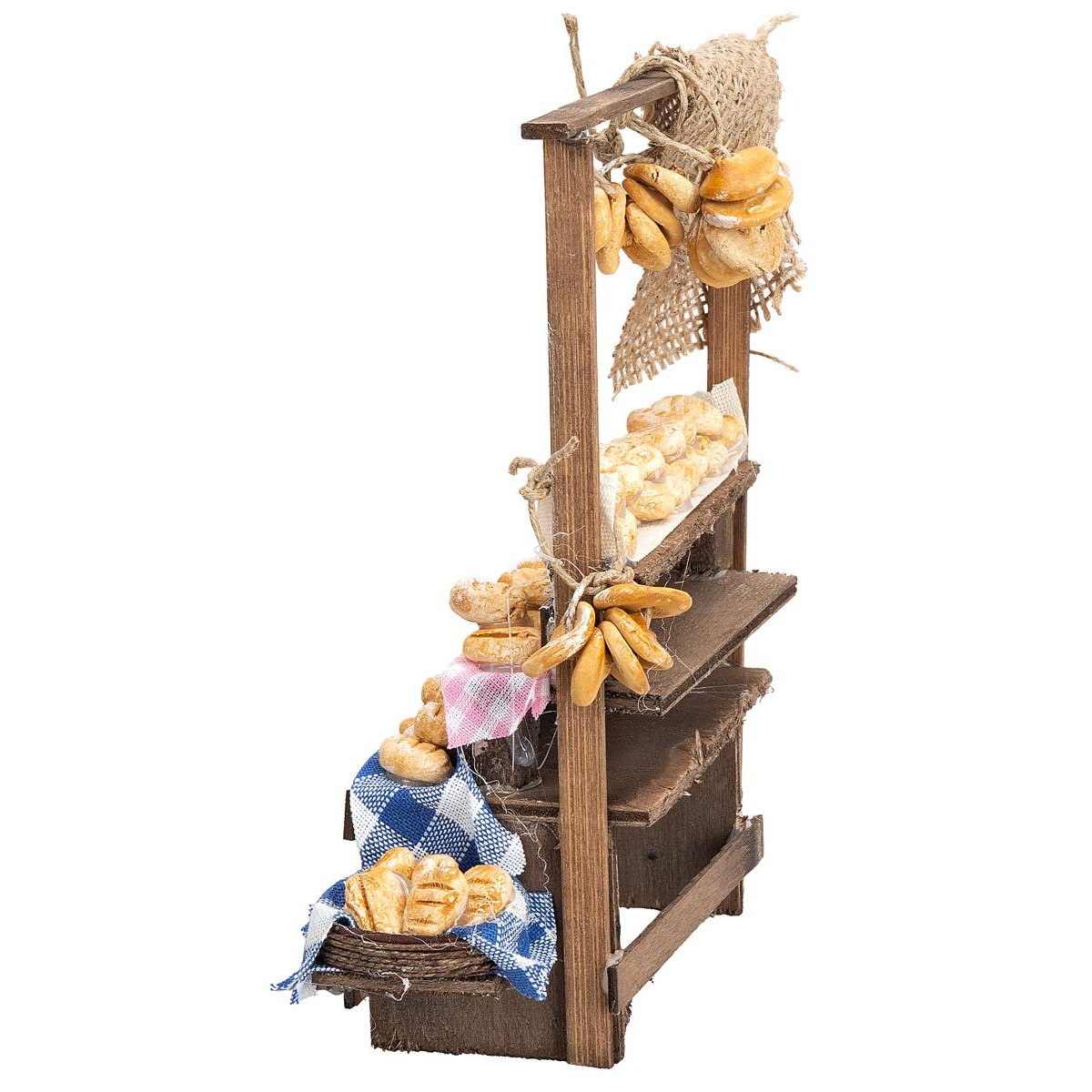 Handcrafted in Italy, it is full of miniature breads neatly arranged on the shelves, with some shapes hanging and cloths enriching the scene.