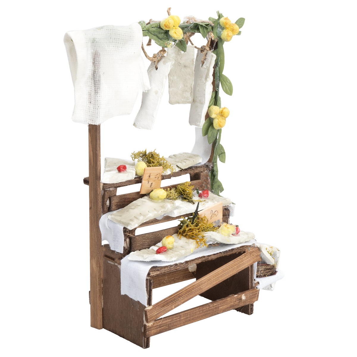 Handcrafted in Italy, it is equipped with hanging codfish arranged on shelves, enriched with small details reminiscent of market shop atmospheres.