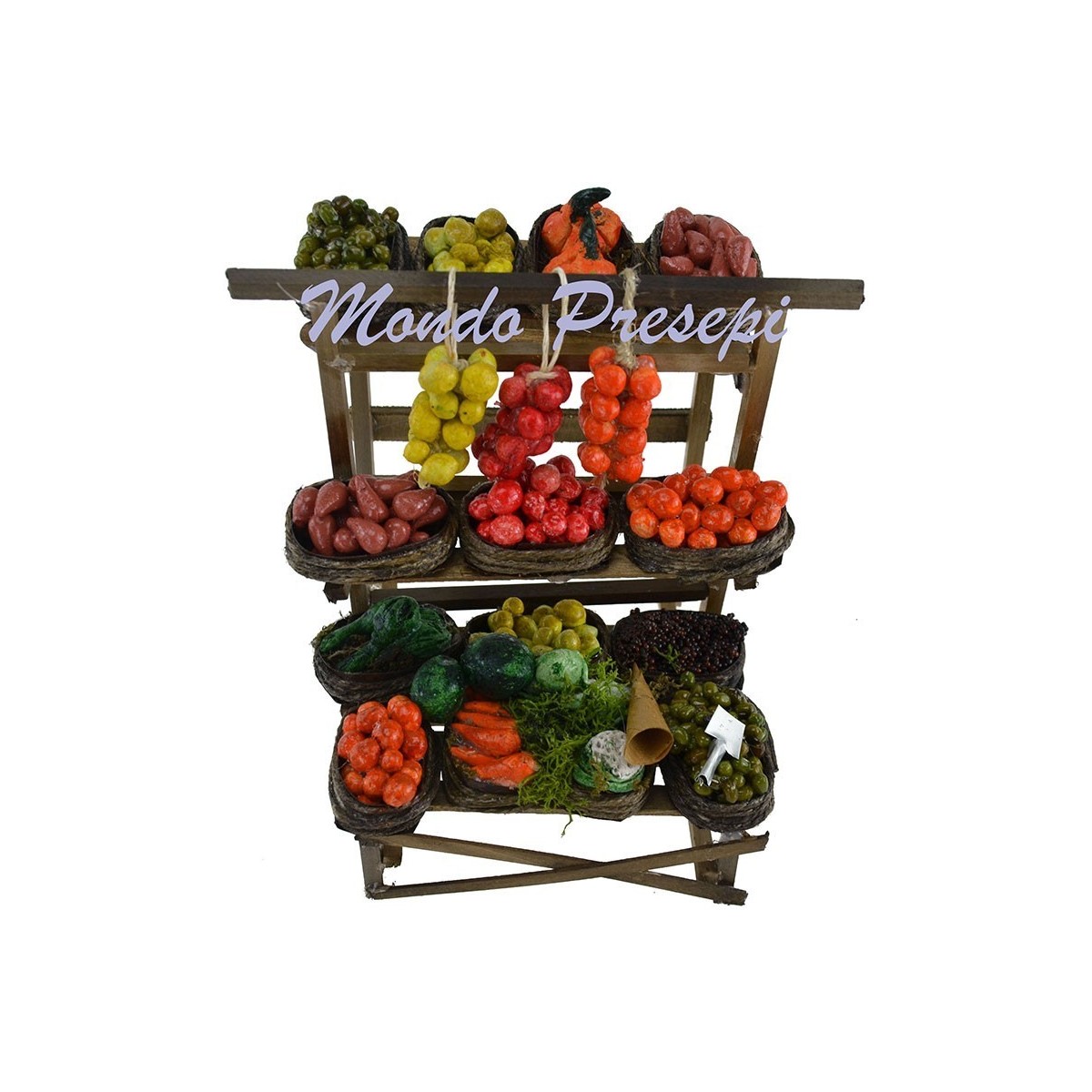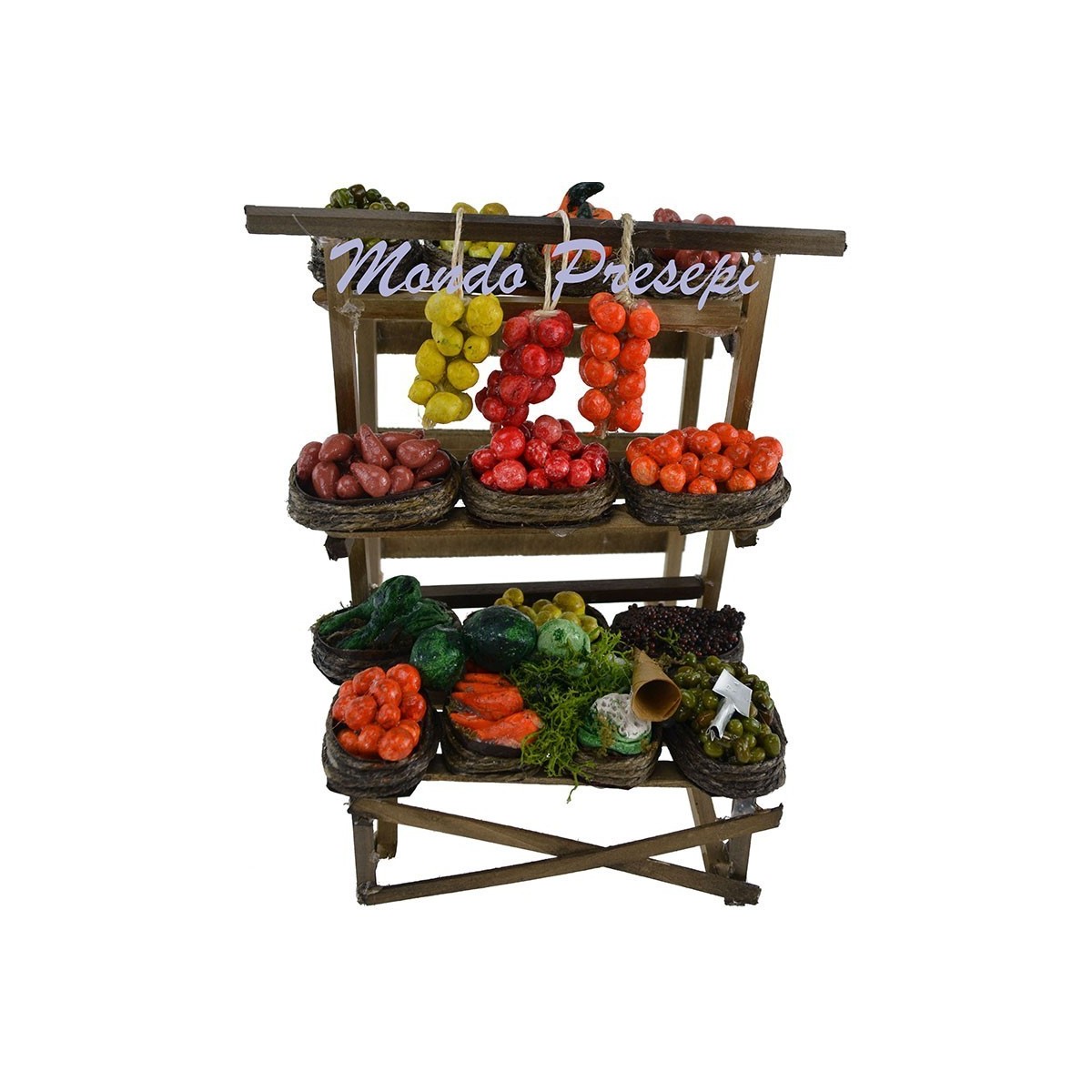 Wooden bench with assorted fruit and vegetable models, recommended for statues height cm 12-14-15.