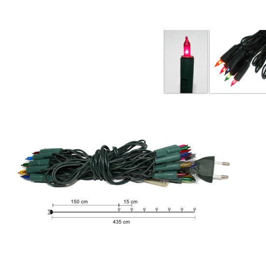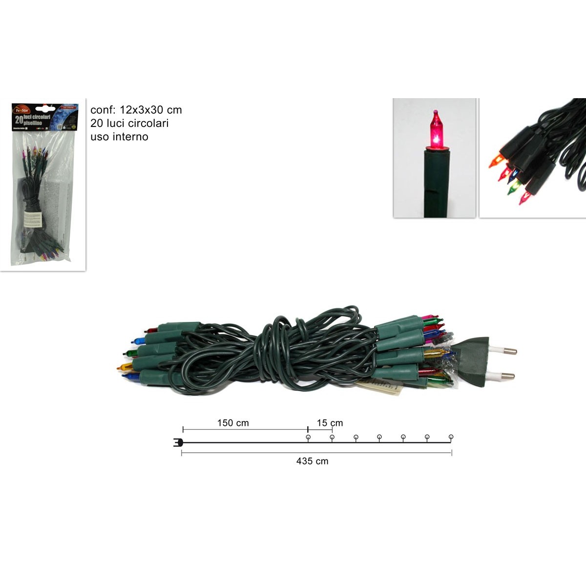 Circular necklace with 20 fixed light multicolor pea-sized lights, powered by electricity.