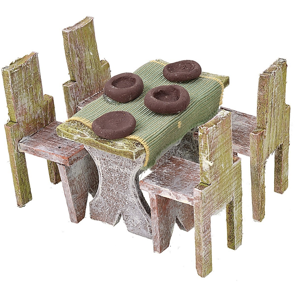 Tavolo in legno con piatti, tovaglia e 4 sedie, consigliato per statue con altezza di statue 10 cm, ideale per la creazione di ambienti casalinghi.