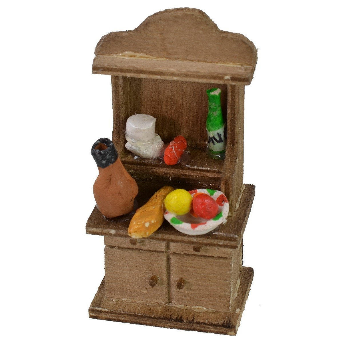 Wooden sideboard with shelves. Inside the shelves there are perfectly made small parts such as some bottles, a basket with fruit, a baguette, cheeses and a salami. Recommended product for statues of height 5-6 h cm.