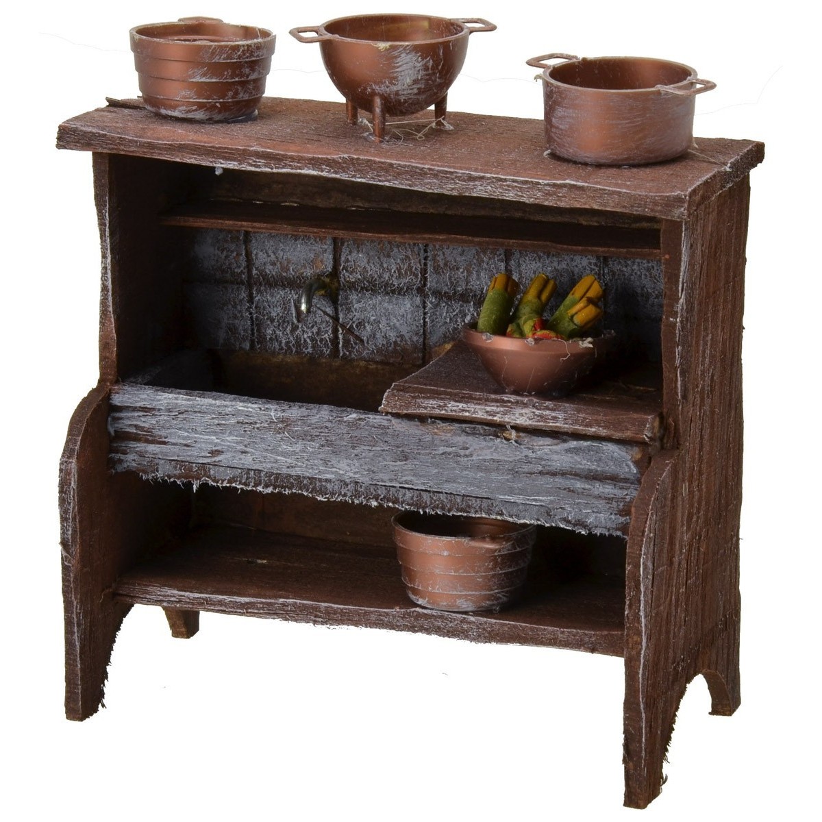 Lavabo da cucina in legno scuro antichizzato con poggia utensili decorato da pentole ed ideale per Presepi fai da te o case di bambole. L'articolo è stato prodotto da artigiani italiani, è consigliato per statue di altezza 12 cm ed è possibile personalizzarlo con le MINUTERIE presenti nel nostro negozio. Nei prodotti correlati sotto la tabella sono disponibili altri complementi d'arredo della stessa serie da abbinare per completare l'ambientazione.