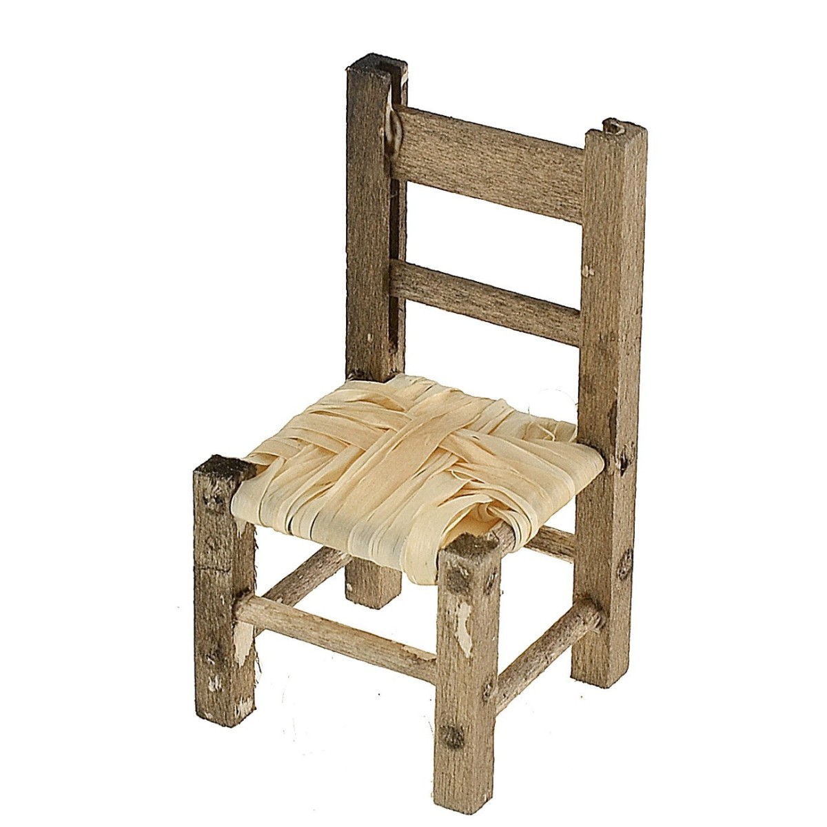 Wooden chair with straw seat, ideal for enriching the settings in your nativity scene. The article is recommended for statues with a height of 8 cm. The product was handcrafted in Italy.