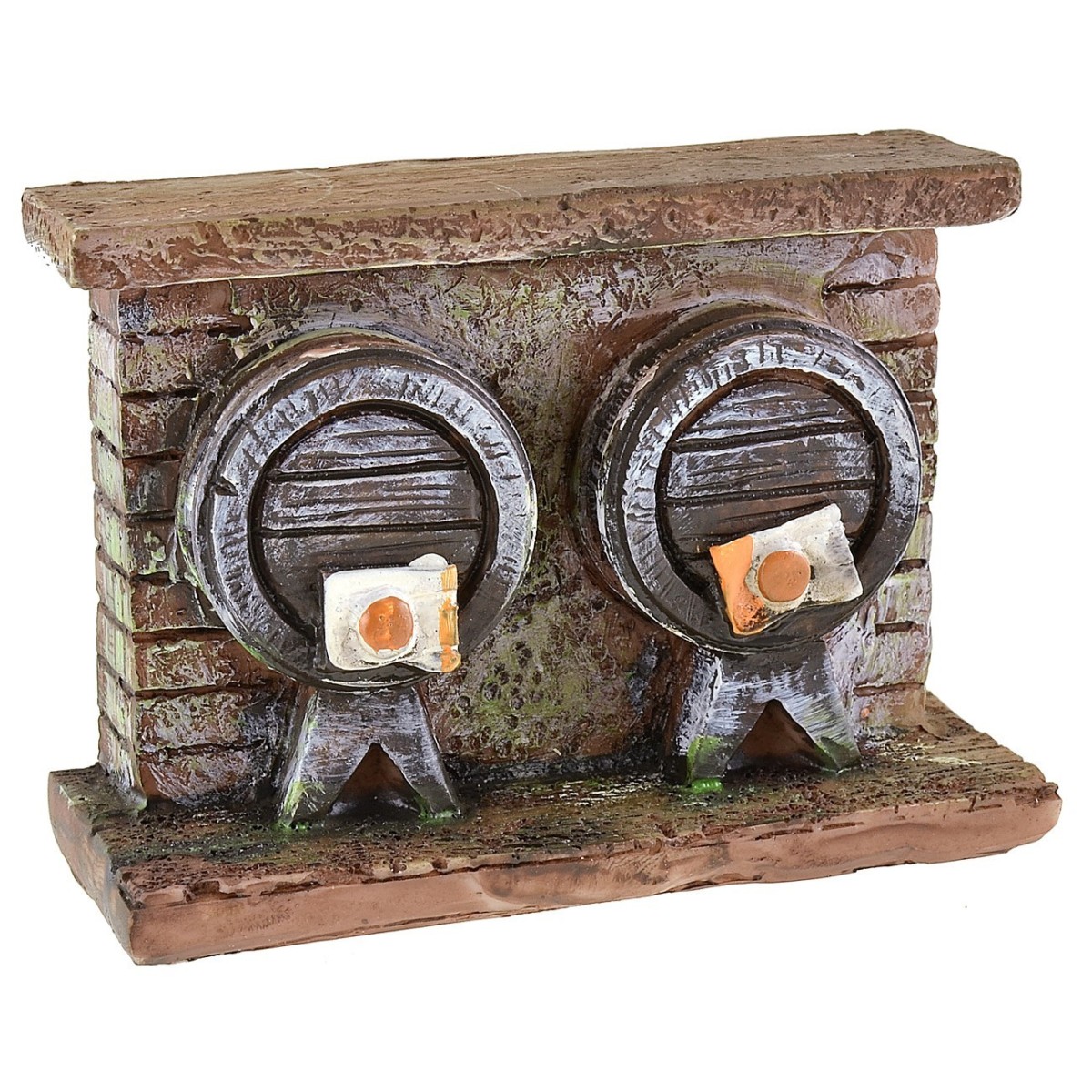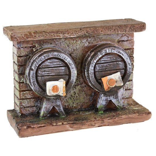 Parete in resina effetto mattoni con due botti sporgenti da cui veniva erogato il vino. Questa scena per presepe è perfetta da inserire, per esempio, in cantine ed è consigliata per statuine di altezza 6-6,5 cm.
