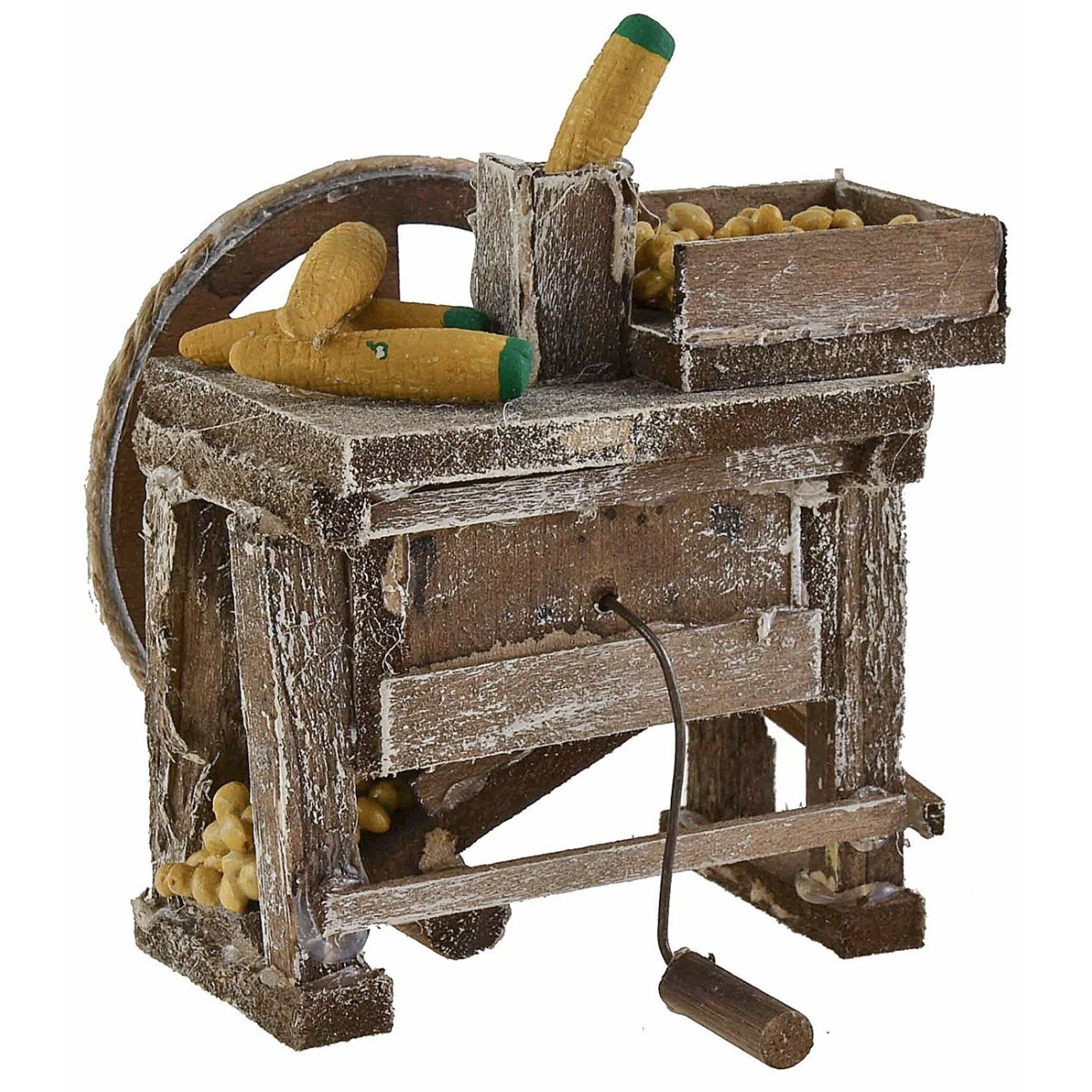 Macina per granoturco realizzata in legno da artigiani italiani, sul piano sono presenti delle pannochie e mais e sul lato è presente la ruota che si potrà far girare manulmente tramite una manovella presente sulla destra. L'attrezzo è ideale per arricchiere ambienti di campagna nel presepe. L'articolo è consigliato per statue altezza 10-12 cm e si precisa che essendo prodotto a mano potrebbe leggermente variare rispetto alla foto. Nella sezione MINUTERIE sono disponibili tanti accessori per presepe da abbinare.