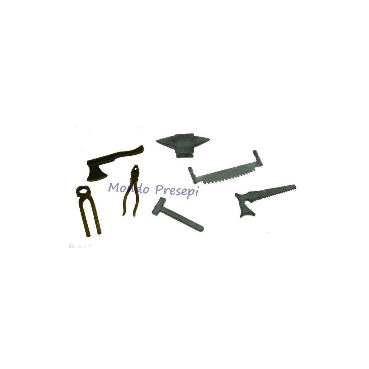 Set of 7 iron work tools: hammer, anvil, pliers, pincers, ax, saw, saw.