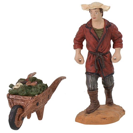 Contadino con carriola di verdure e cappello in tessuto 10 cm Oliver. Le statue della medesima serie hanno volti espressivi e ben rifiniti nei dettagli.