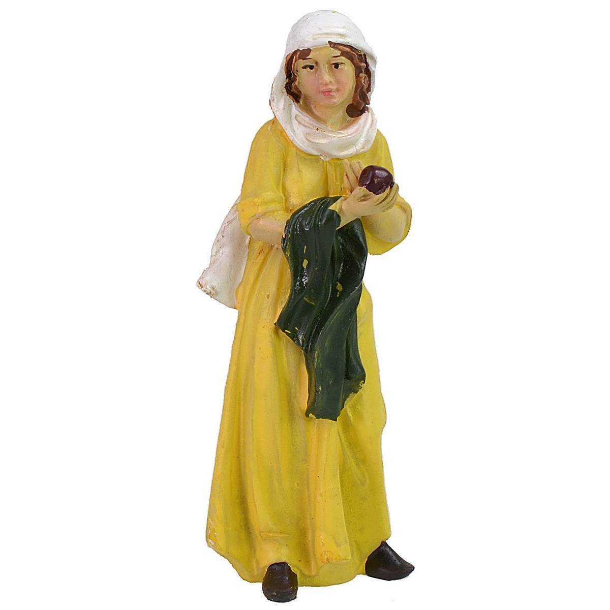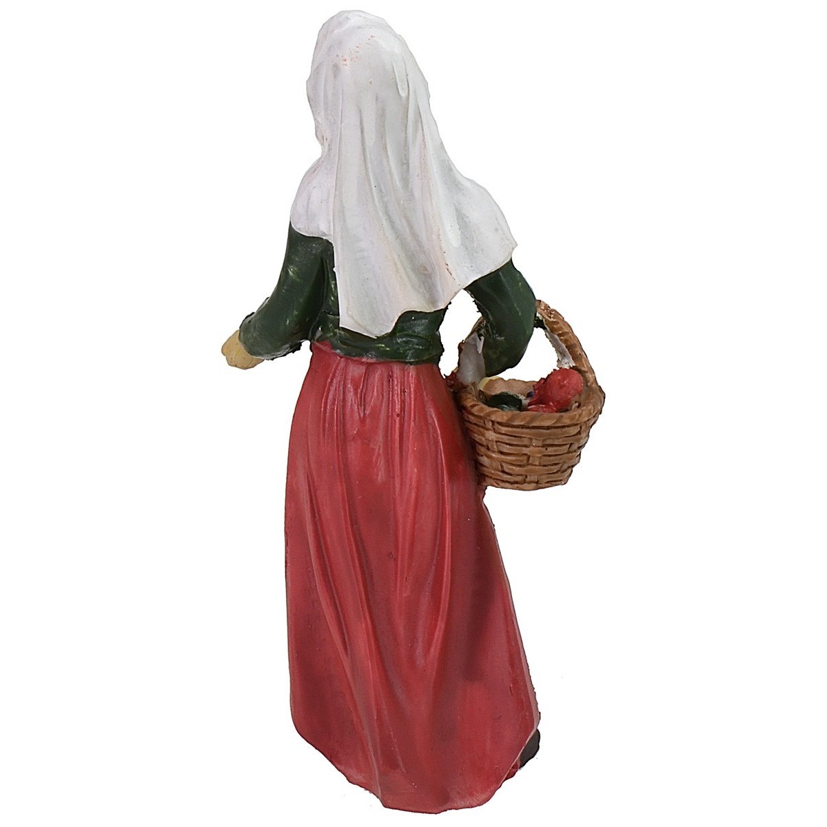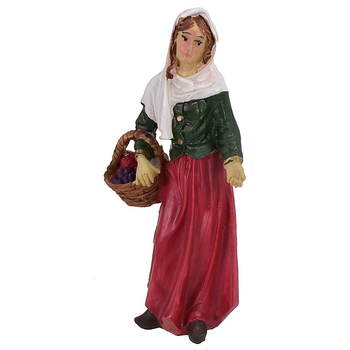 Finely finished 11.5 cm series resin greengrocers, flanked by a large tidy wooden counter full of fruit and vegetables displayed for sale.