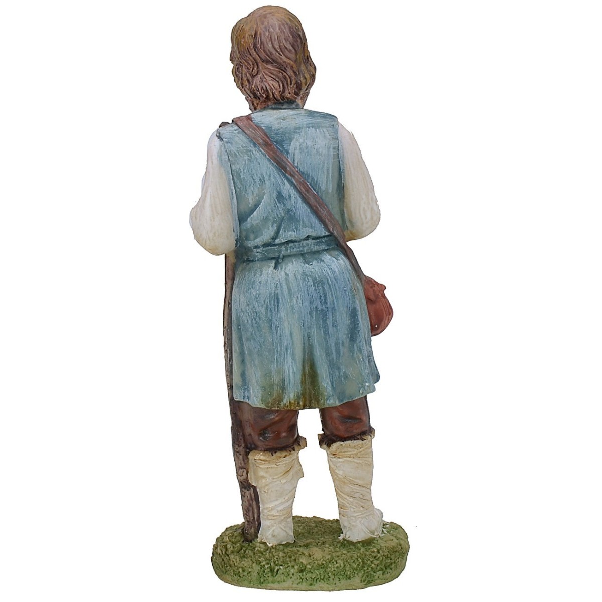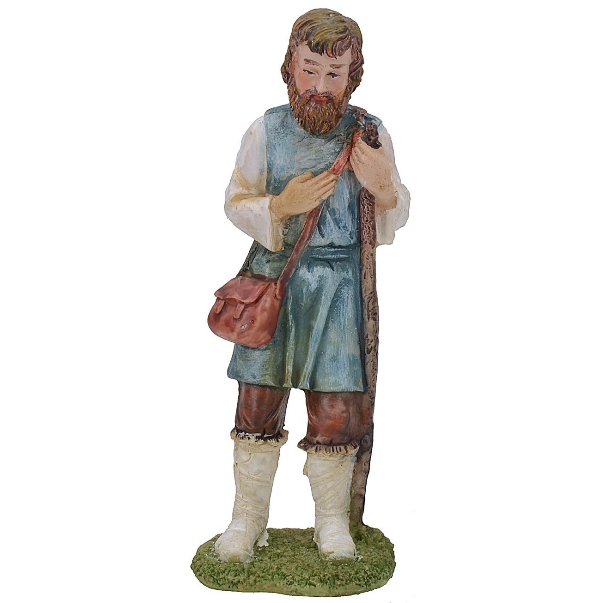 Uomo in viaggio con borsa a tracolla e bastone serie 15 cm in resina dipinta a mano.