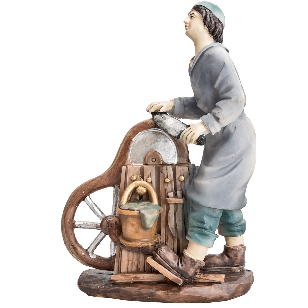 The set depicts statues of artisans: a knife grinder at work with a grindstone, a baker with a bread stand, a butcher with a meat stand, and a pasta maker rolling out dough.
