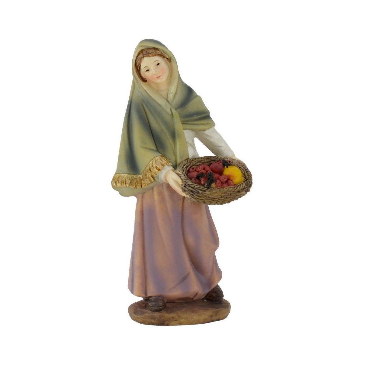 Woman with chief chino carrying a basket of fruit, green shawl on the gold-colored head and long pink skirt height 15 cm in resin.