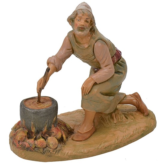 Uomo in ginocchio che cucina davanti ad un bivacco serie 12 cm Fontanini dipinta a mano. Le statue del presepe tradizionale Fontanini, prodotte a mano in Italia, hanno volti espressivi e ben rifiniti nei dettagli.