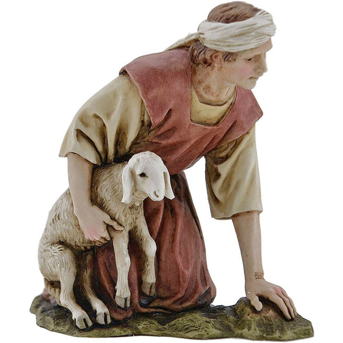 Pastore inginocchiato con agnello in resina, dipinto a mano serie Landi Moranduzzo 15 cm. Sul nostro sito troverai disponibile le statue per presepe della stessa serie.