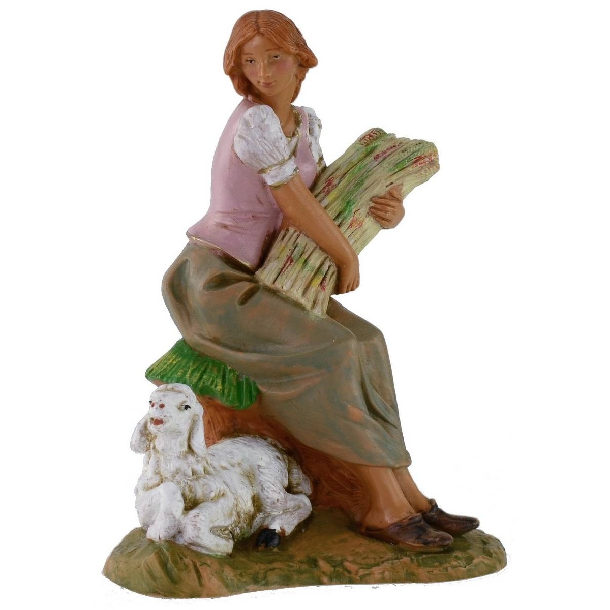 Shepherdess sitting with a band in her hands and a sheep by her side, 19 cm Fontanini series, hand painted. The statues of the traditional Fontanini nativity scene have expressive faces and well finished in detail.