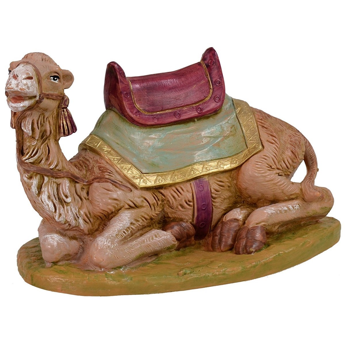 Hand painted camel sitting on a base with saddle on the humps series 19 cm Fontanini. Statue of the traditional Fontanini nativity scene with an expressive face and well finished in the details.