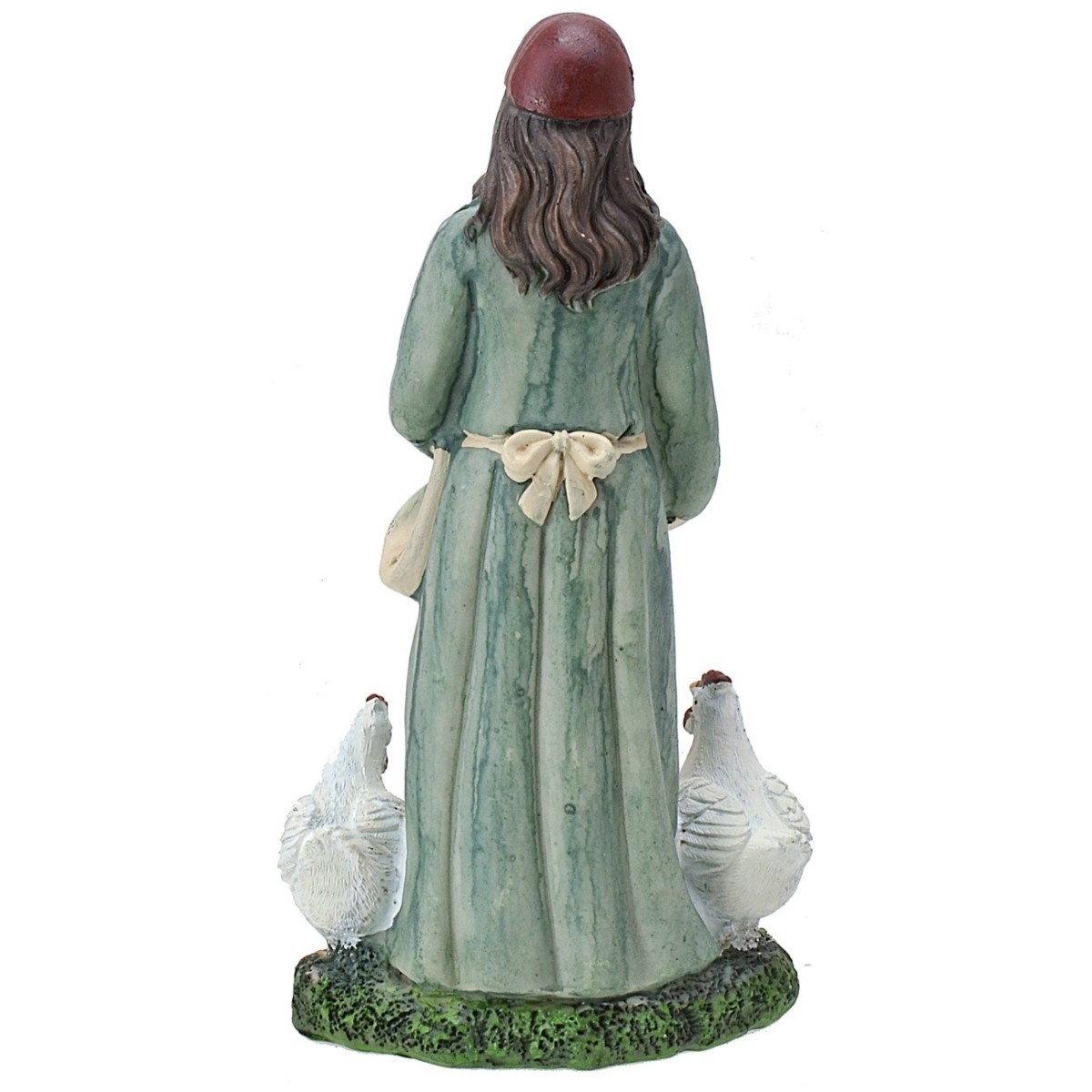 Peasant woman with 20 cm resin hens with an expressive and well finished face, she wears a red headdress and a long blue dress with a white apron which she holds up with one hand to contain the feed she is distributing.