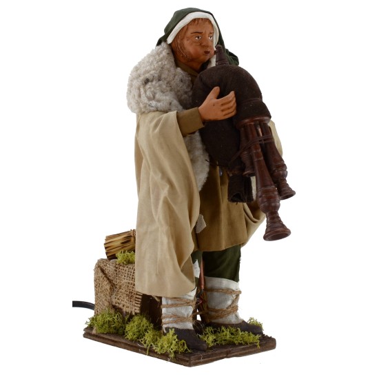 Zampognaro in motion. The scene is very rich in detail : in the foreground we see the man wave to the right and the left, thanks to the movement of the bust, simulating the action of playing the instrument he holds between his hands. Other characteristic elements of the scene are the surrounding vegetation green and the various straw fascins behind the man. The statue is made in terracotta and painted by hand in Italy by savvy craftsmen with well-refinished fabric clothes. The statue for the Classic Presepe and / or Neapolitan measures 24 cm and is characterized by the use of materials such as wood, cloth and terracotta.