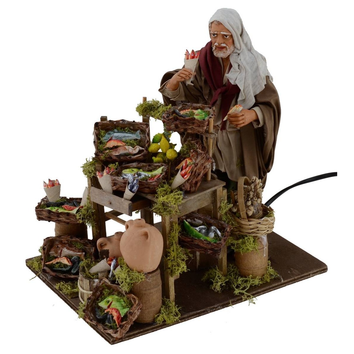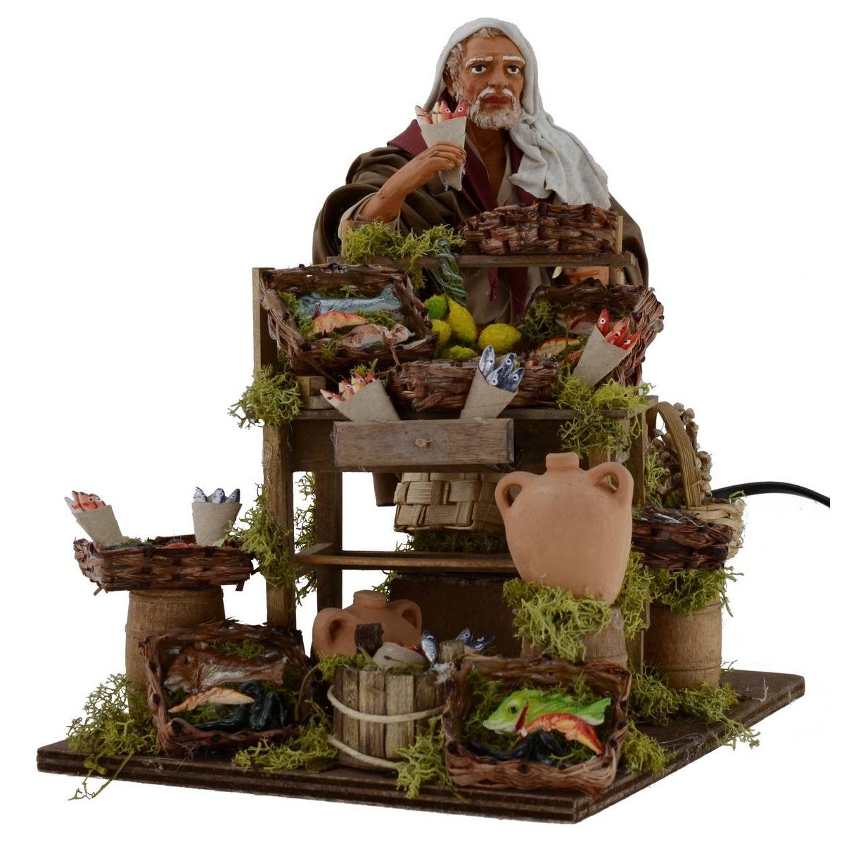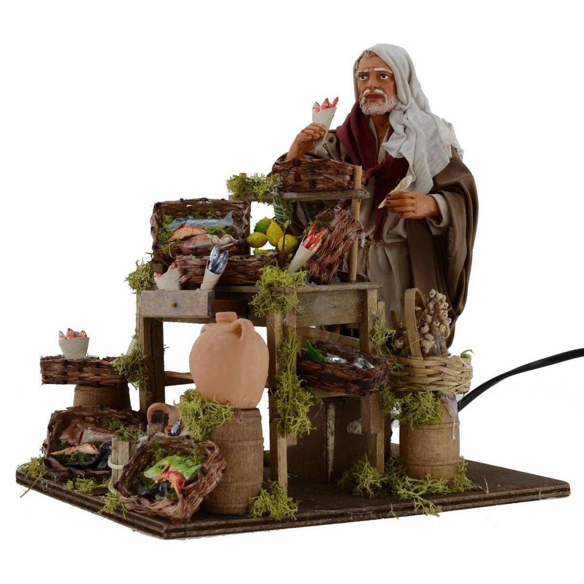 Pescieving him on the move. The scene is very rich in detail : in the foreground we see multiple cests of fresh fish, both adagiarised on the ground and on the wooden bench. In the second floor, instead, we see the man raising and lowering a cone with inside the fish and, precisely thanks to the movement of the arm, it would seem to simulate an invitation to purchase. Other characteristic elements of the scene are the surrounding vegetation green, the different amphorae and hatches featured in the scenography. The statue is made in terracotta and painted by hand in Italy by savvy craftsmen with well-refinished fabric clothes. The statue for the Classic Presepe and / or Neapolitan measures 25 cm and is characterized by the use of materials such as wood, cloth and terracotta.