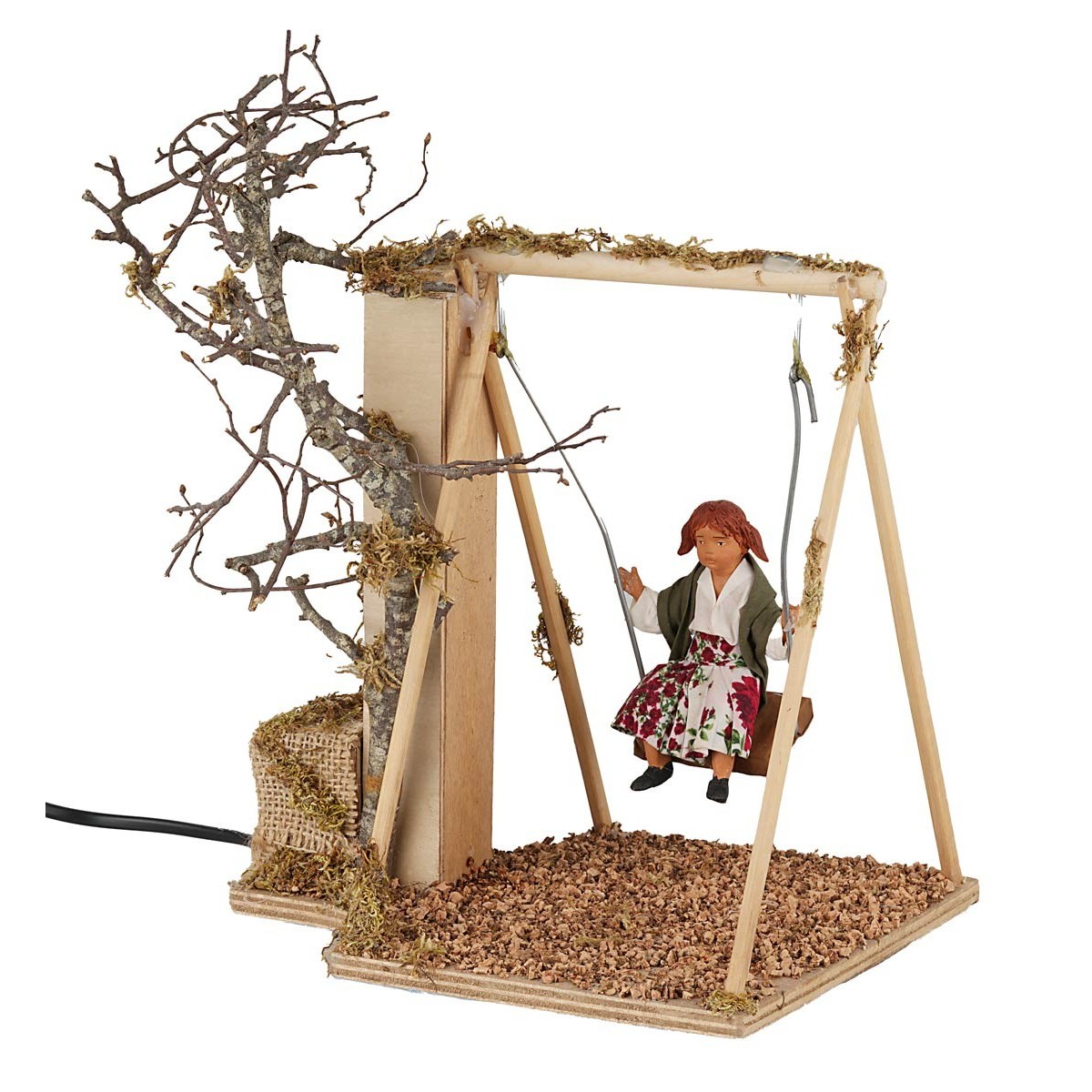 Girl swinging on a moving swing. The figurine is made of terracotta and hand-painted in Italy by skilled artisans with well-finished fabric clothes. The figure for the classic and/or Neapolitan Nativity scene is made of terracotta and is powered by electricity. Please note that the product details may vary as it is handcrafted.
