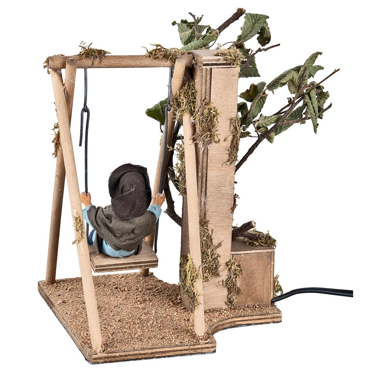 Child on swing in motion, 24 cm tall. The child is seated on a swing made of wood, adorned with vegetation, and moves back and forth. The statue is made of terracotta, hand-painted in Italy by expert artisans, and features finely finished fabric clothing. Suitable for the classic and/or Neapolitan Nativity scene, it uses materials such as wood, fabric, and terracotta, and is powered by electricity.