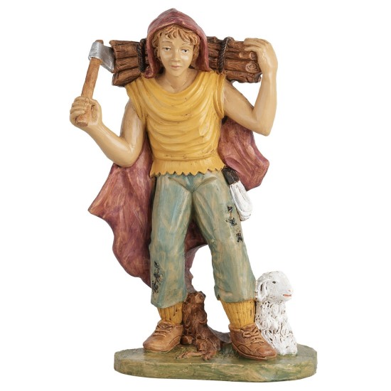 Lumberjack with a bundle on his shoulders, an axe in hand, and a lamb at his feet. The statue belongs to the 30 cm Euromarchi series in PVC, characterized by expressive and well-finished faces. The item is also ideal for outdoor Nativity scenes as the materials have been treated and are resistant to weather elements.