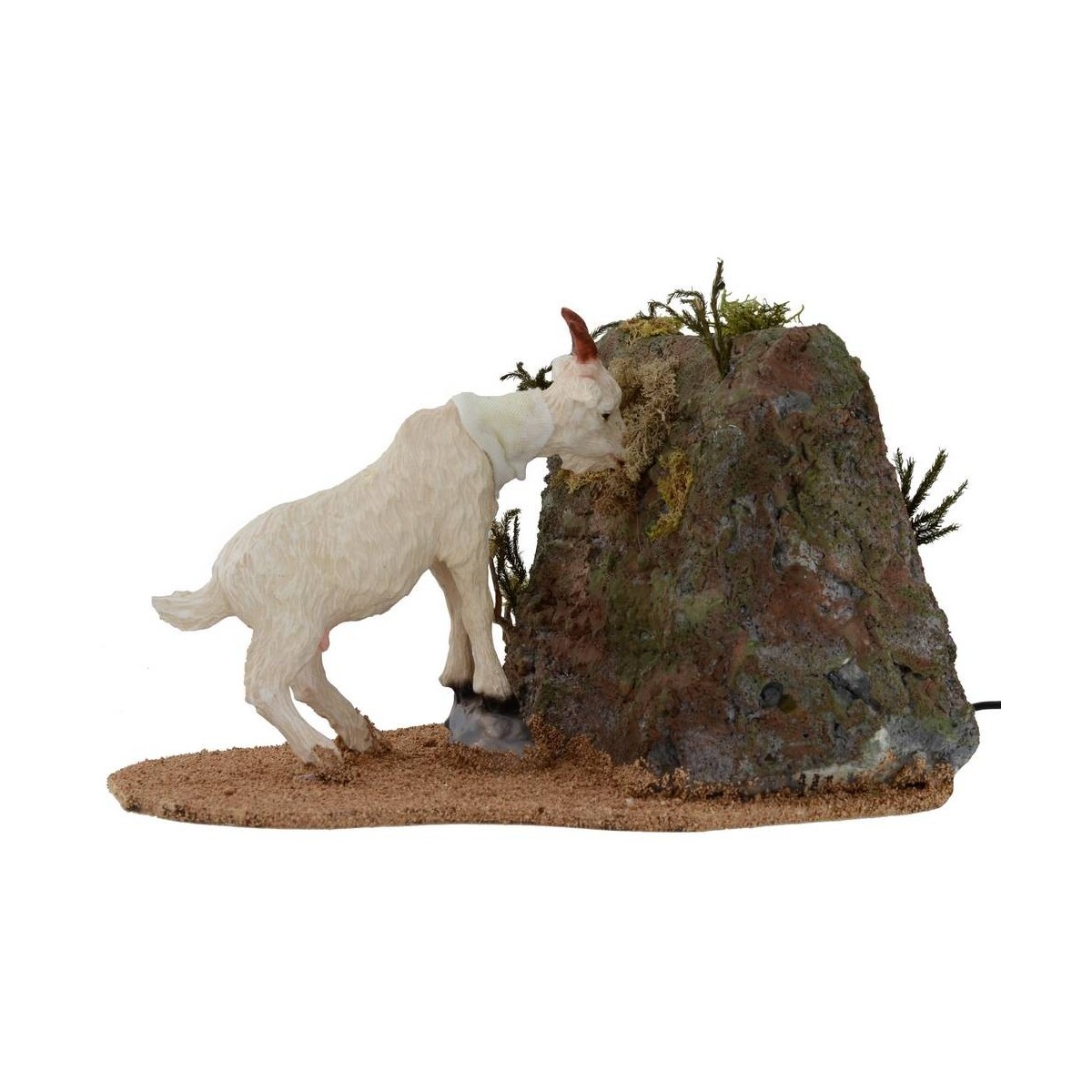 White Capra moving the boss in the act of eating the vegetation grown on a stone rub. The animal is truly well-refinished. This scene has been produced entirely in Italy by savvy hands craftsmen with polystyrene, resin, wood and cork.