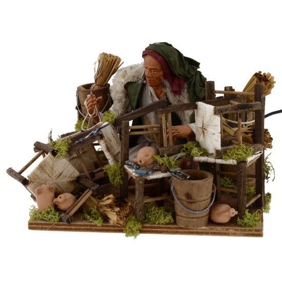 Repairman of chairs in motion. The scene is very rich in detail : in the foreground we see the man, seated, who thanks to the movement of the arm, simulates the action of fixing a chair. All around, ground-to-ground, we notice the presence of multiple chairs and tools for their repair. Other characteristic elements of the scene are the surrounding vegetation green, some amphorae, tinoes, and straw beams. The statue is made in terracotta and painted by hand in Italy by savvy craftsmen with well-refinished fabric clothes. The statue for the classical and / or Neapolitan Presepe, seated, measures 14 cm and is characterized by the use of materials such as wood, cloth and terracotta ; it is part of the series of statues from 30 cm.