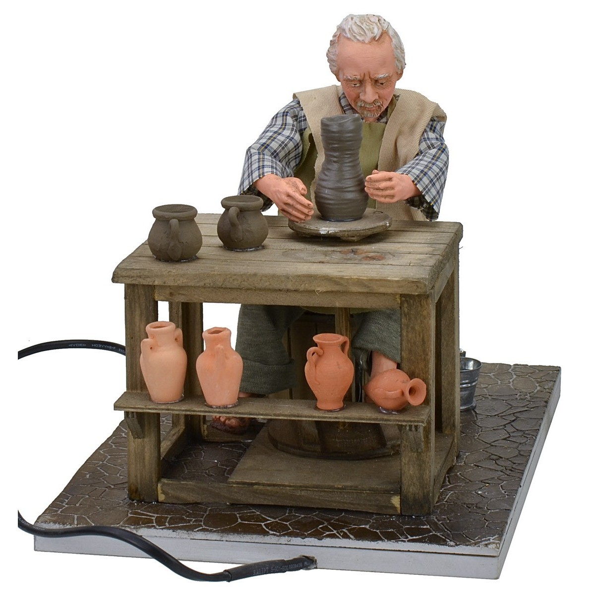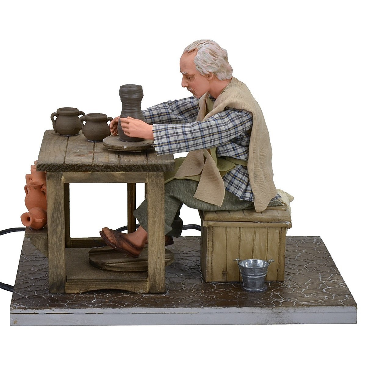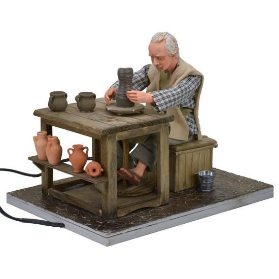 Artigiano seduto in movimento che lavora la creta e la terracotta, col piede gira il tornio e con la mano destra che si alza e bassa da forma al vaso. La statua presenta un volto molto espressivo ed è stata curata nei minimi dettagli dai colori, agli abiti in tessuto e dal movimento veramente molto realistico e fluido. L'articolo è stato realizzato in resina da maestri artigiani italiani ed il meccanismo è funzionante a corrente. Essendo un prodotto realizzato interamente a mano i colori degli abiti possono variare.