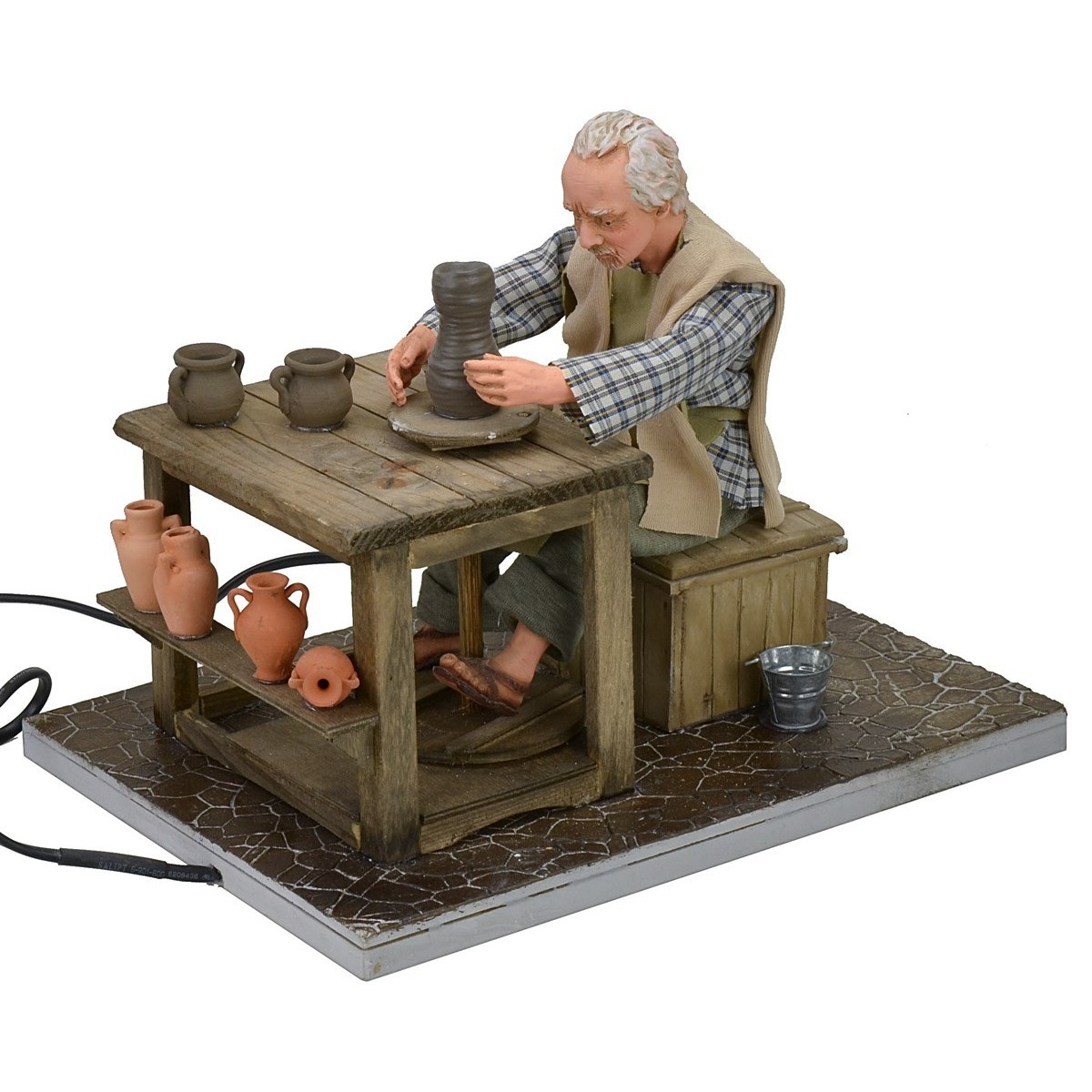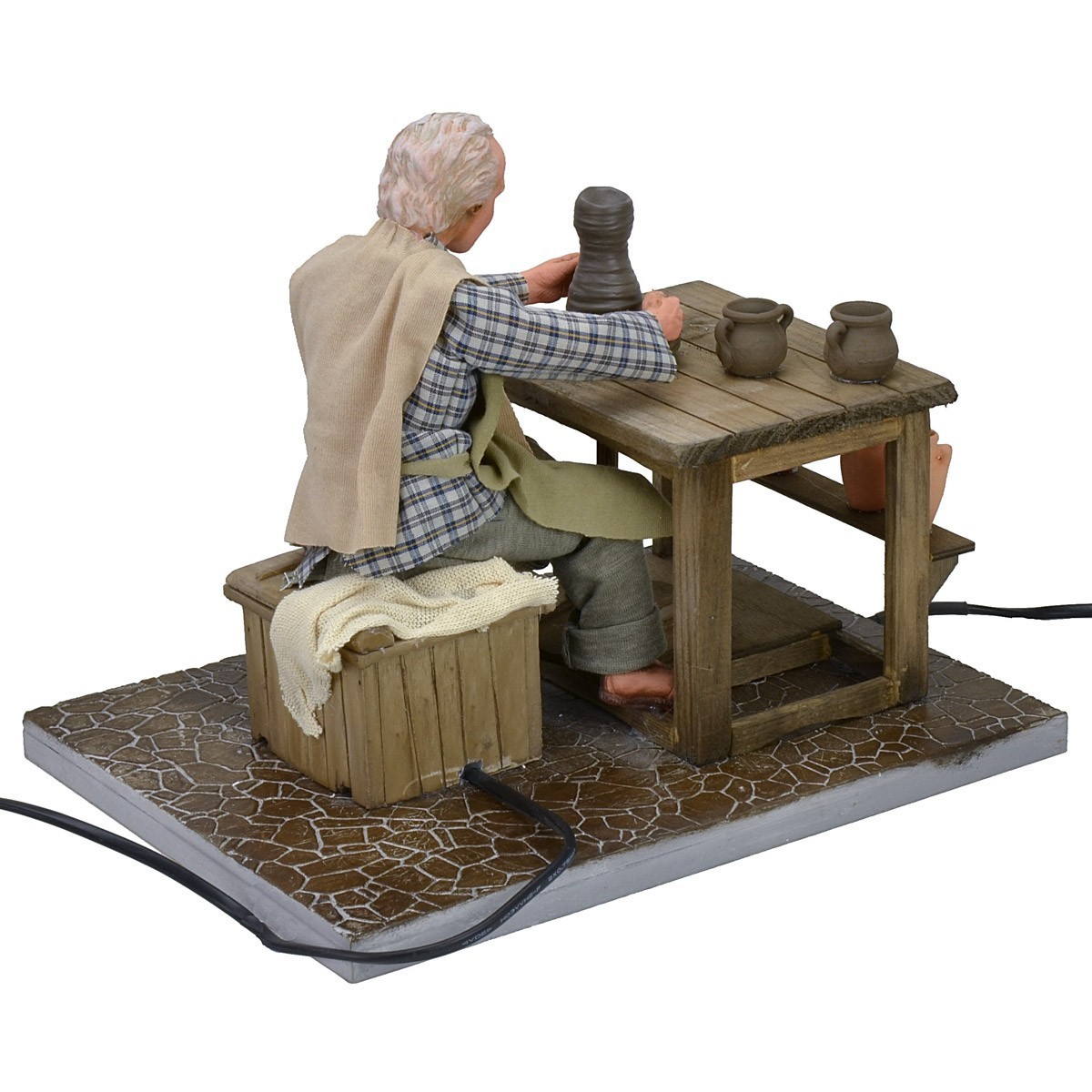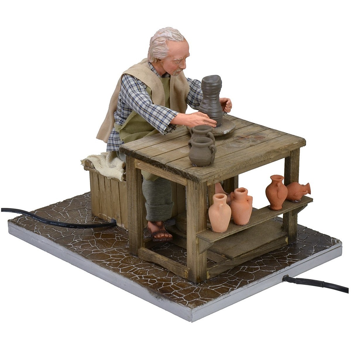 Artigiano seduto in movimento che lavora la creta e la terracotta, col piede gira il tornio e con la mano destra che si alza e bassa da forma al vaso. La statua presenta un volto molto espressivo ed è stata curata nei minimi dettagli dai colori, agli abiti in tessuto e dal movimento veramente molto realistico e fluido. L'articolo è stato realizzato in resina da maestri artigiani italiani ed il meccanismo è funzionante a corrente. Essendo un prodotto realizzato interamente a mano i colori degli abiti possono variare.