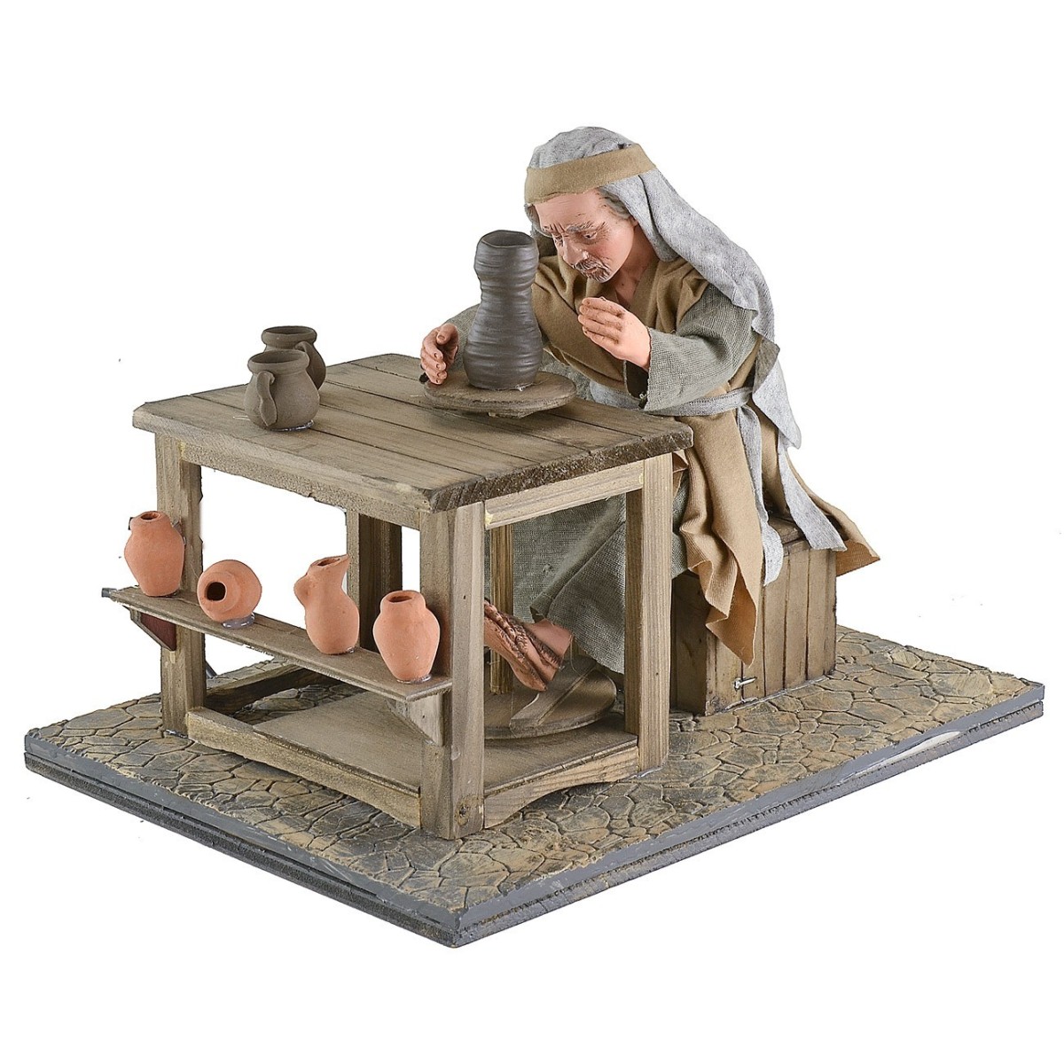 Arab potter sitting in motion while working the terracotta, turns the wheel with his foot and shapes the vase with his right hand that rises and falls. The statue has a very expressive face and attention has been paid to the smallest details from the colours, to the fabric clothes and the very realistic and fluid movement. The item was made of resin by Italian master craftsmen and the mechanism works with electricity. Being a product made entirely by hand, the colors of the clothes may vary from the photos.