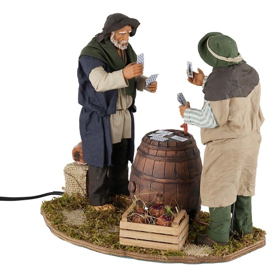 Two 30 cm series men who simulate the action of playing cards with the movement of their arms. The figurine is made of terracotta and hand-painted in Italy by skilled artisans with well-finished fabric clothes. The figure for the classic and/or Neapolitan Nativity scene, is made of terracotta and is powered by electricity. It is specified that the details of the product may vary as it is handcrafted.