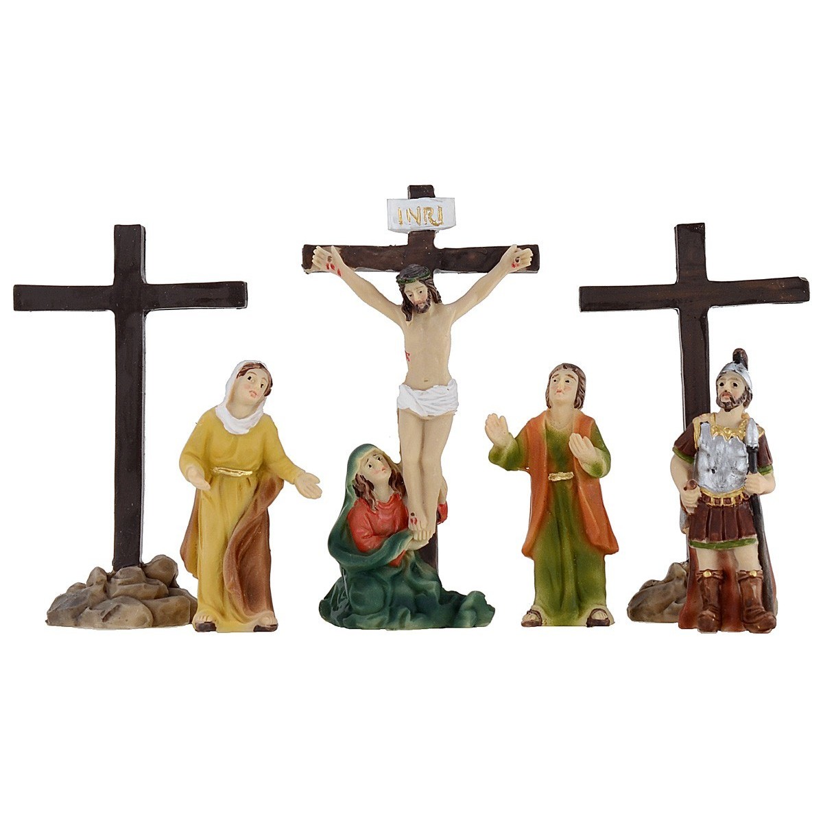 Set di 6 statue Pasquali per la rappresentazione della Crocifissione di Gesù sul Monte Calvario. Le statue della medesima serie hanno volti espressivi e ben rifiniti nei dettagli e sono realizzate interamente in resina. Il prodotto è ideale per la creazione di composizioni Pasquali come Diorami e Presepi.